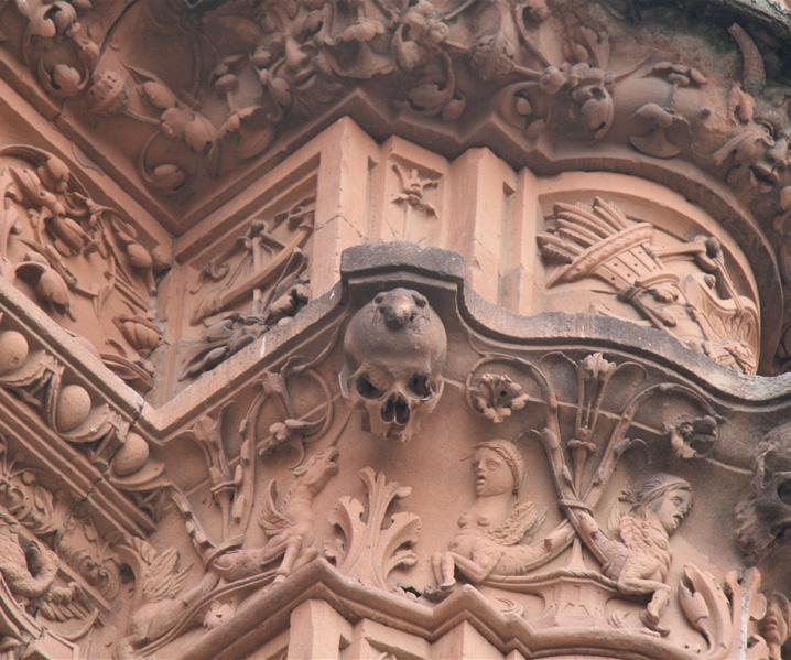 Den snidade porten till Salamancas universitet stod färdig 1553. Det har diskuterats både vitt och brett vad konstnären bakom ornamenten hade i tankarna när han gjorde dem – en av dem föreställer en groda som sitter på en döskalle.