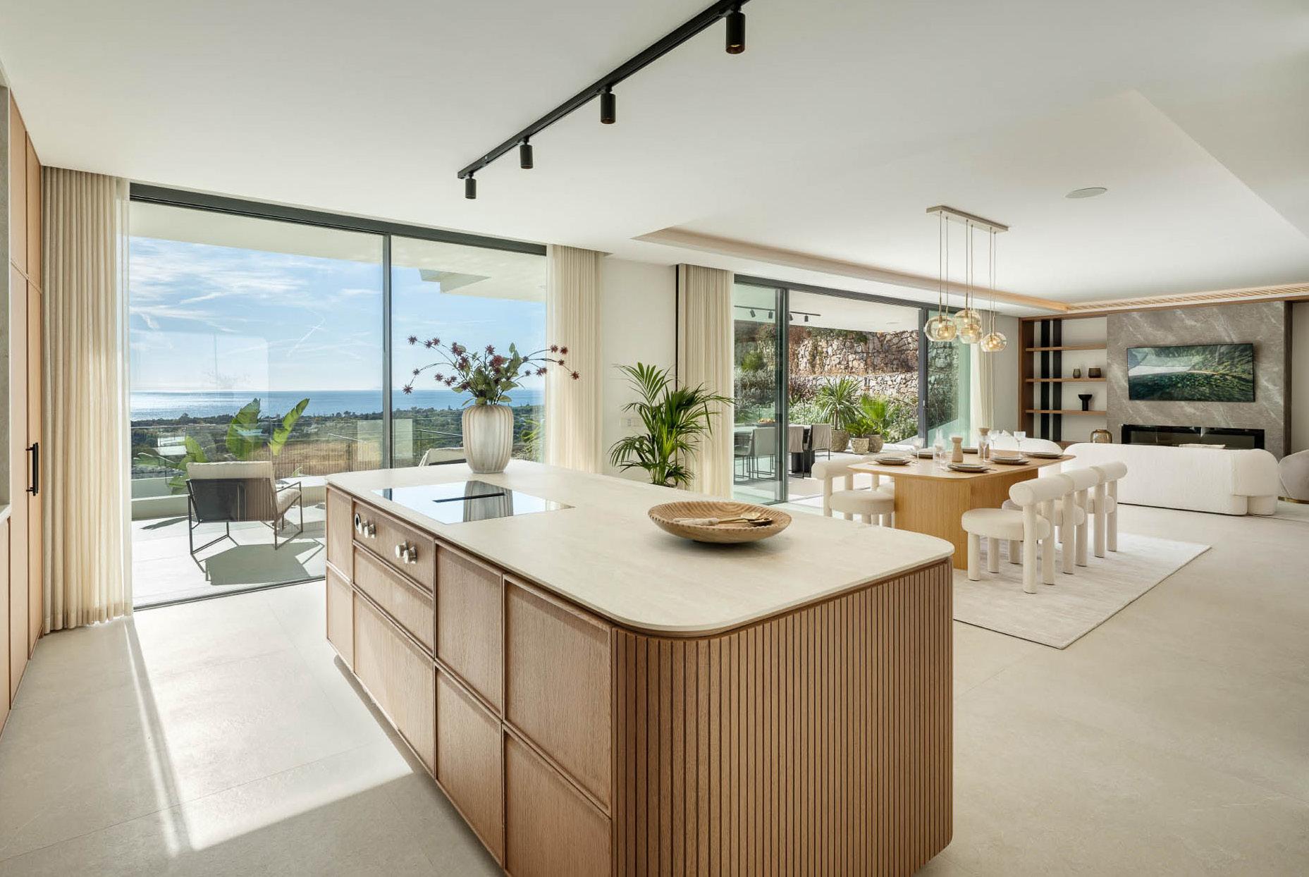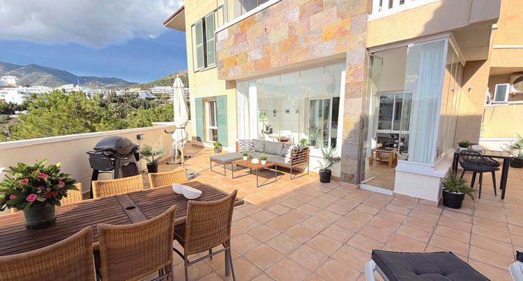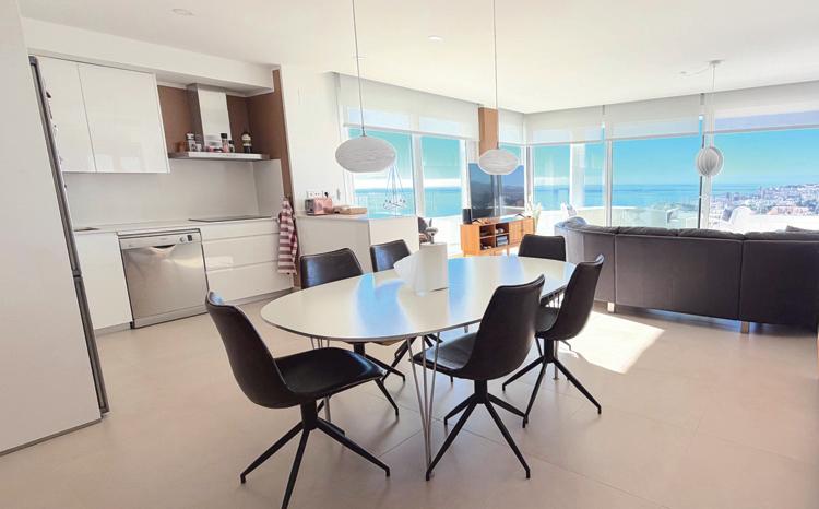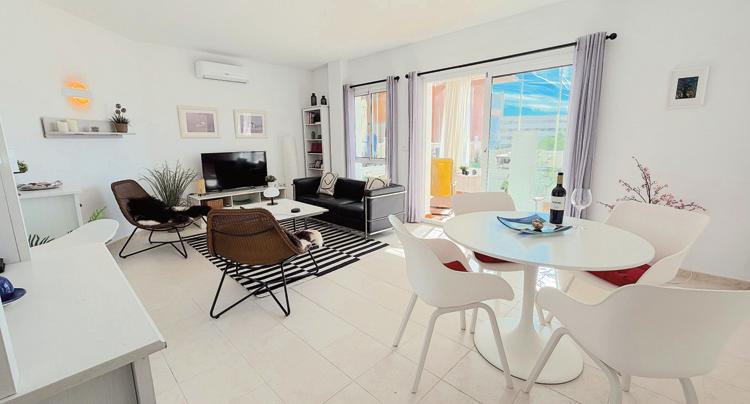 Moderne hjørnelejlighed med masser af naturligt lys og en 35 m² stor terrasse, der går rundt om lejligheden, med panoramaudsigt over hav og bjerge. Der er åbent opholdsrum med stue og køkken i ét, elektriske persienner i hele boligen og stort bryggers. Boligen sælges fuldt møbleret.