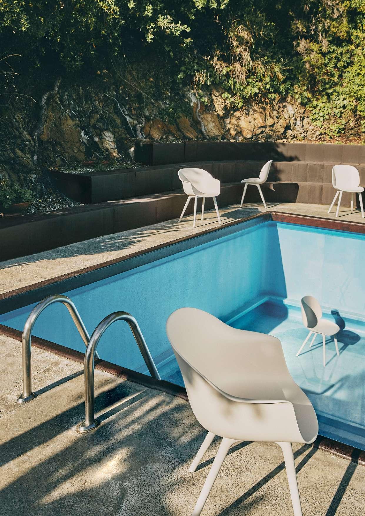 O FAlthough the chairs are still perfectly suitable for indoor use, GamFratesi has modified the designs to ensure they are also optimized for exterior settings. Pushing the boundaries of ther moplastic technology, the chairs’ curved outer shells benefit from the addition of a UV additive. This strengthens the poly propylene, preventing the two colors – New Beige and Alabas ter White – from fading due to weather damage, thus making two already versatile chairs even more dynamic. A matt-satin finish gives both chairs an engaging tactility, while their light weight enables both to be easily moved, further blurring the frontiers between internal and external spaces.