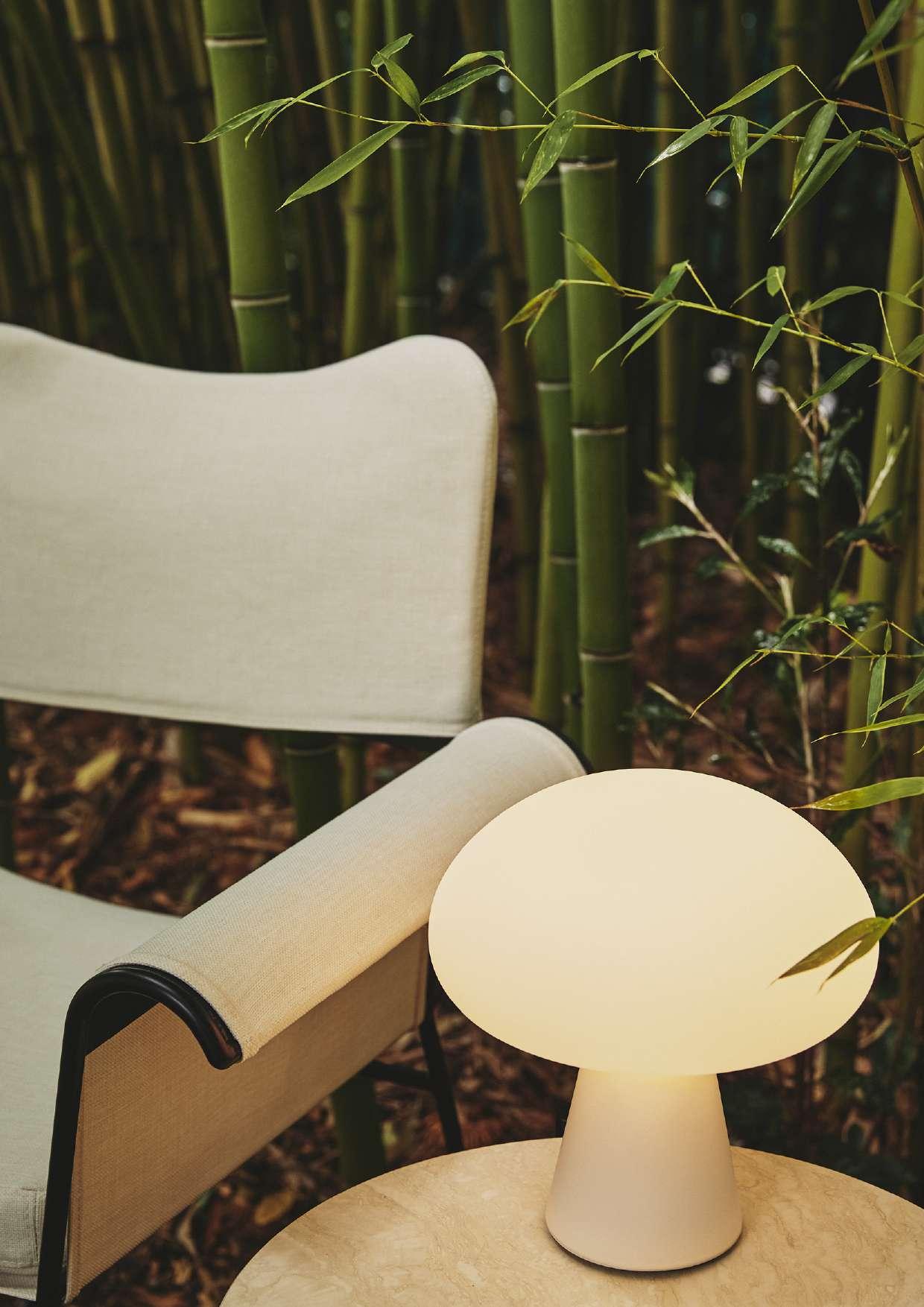 Half a century later, with the endorsement of his family, GUBI has put Curry’s innovative design into production for the first time, now as a portable version. With a frosted, mouth-blown glass shade, as used for Curry’s original lamps, and integrat ed dimmable-LED light source, the rechargeable lamp can easily be moved between inside and out. With a complete charge in four and a half hours, providing up to 40 hours of light, Obello will create a cozy atmosphere as the sun starts to set and last well into the night. The Obello Lamp is an icon ic space-age design that will make a strong statement, either as a playful center piece or a point of curiosity within any outdoor space.