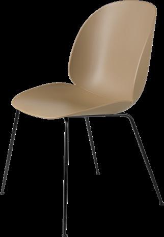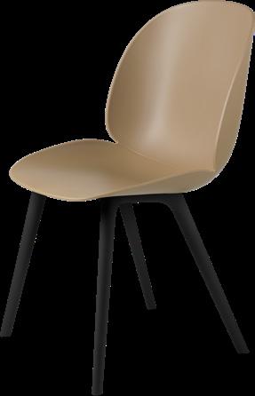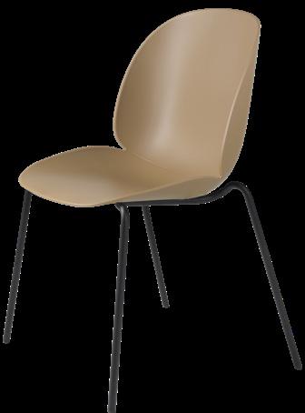 From left to right: Beetle Dining Chair with Black Base, in plastic in shell New Beige Beetle Dining Chair with Black Base, in Plastic in shell Amber Brown. Beetle Dining Chair in Plastic shell in Sweet Pink.