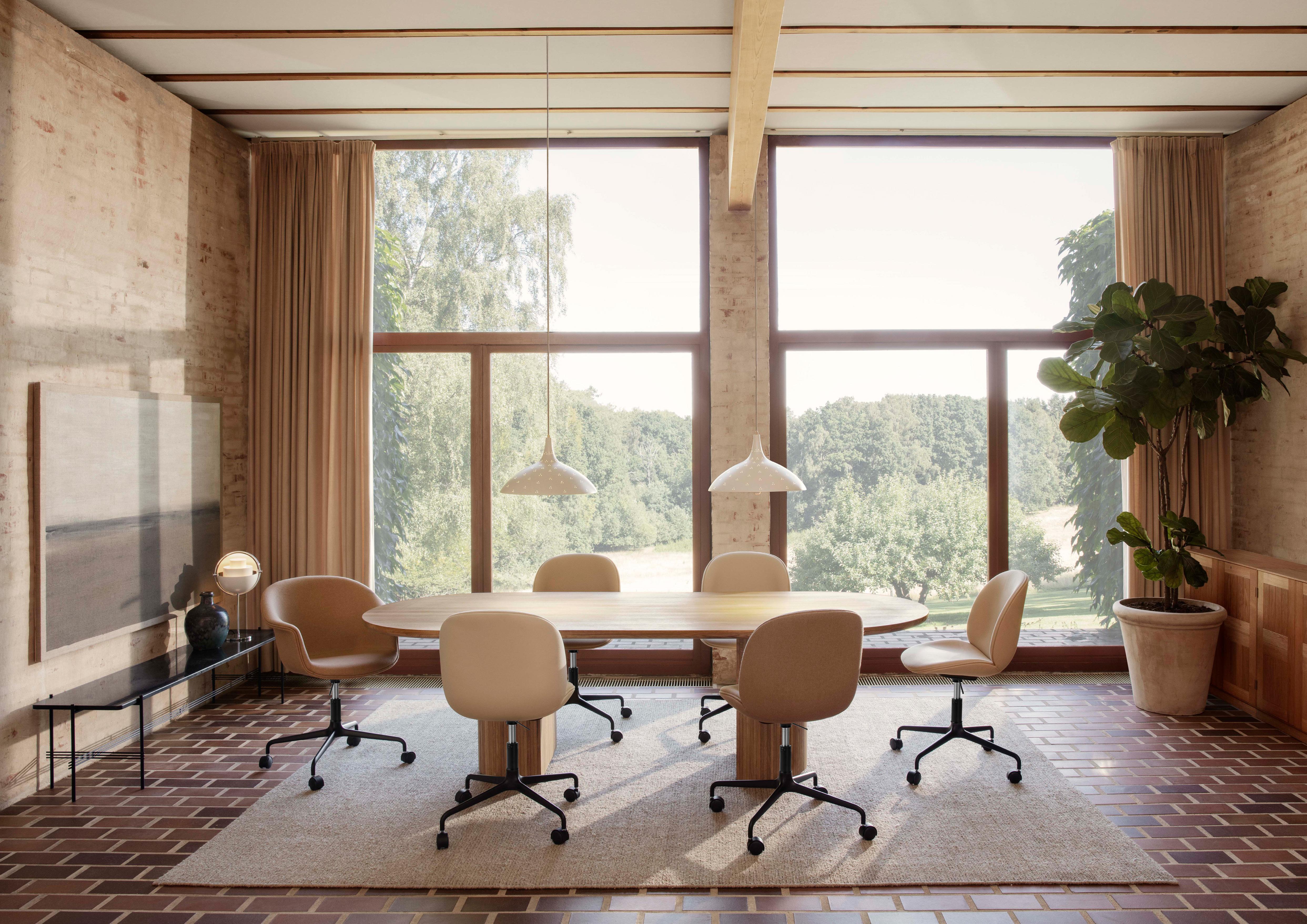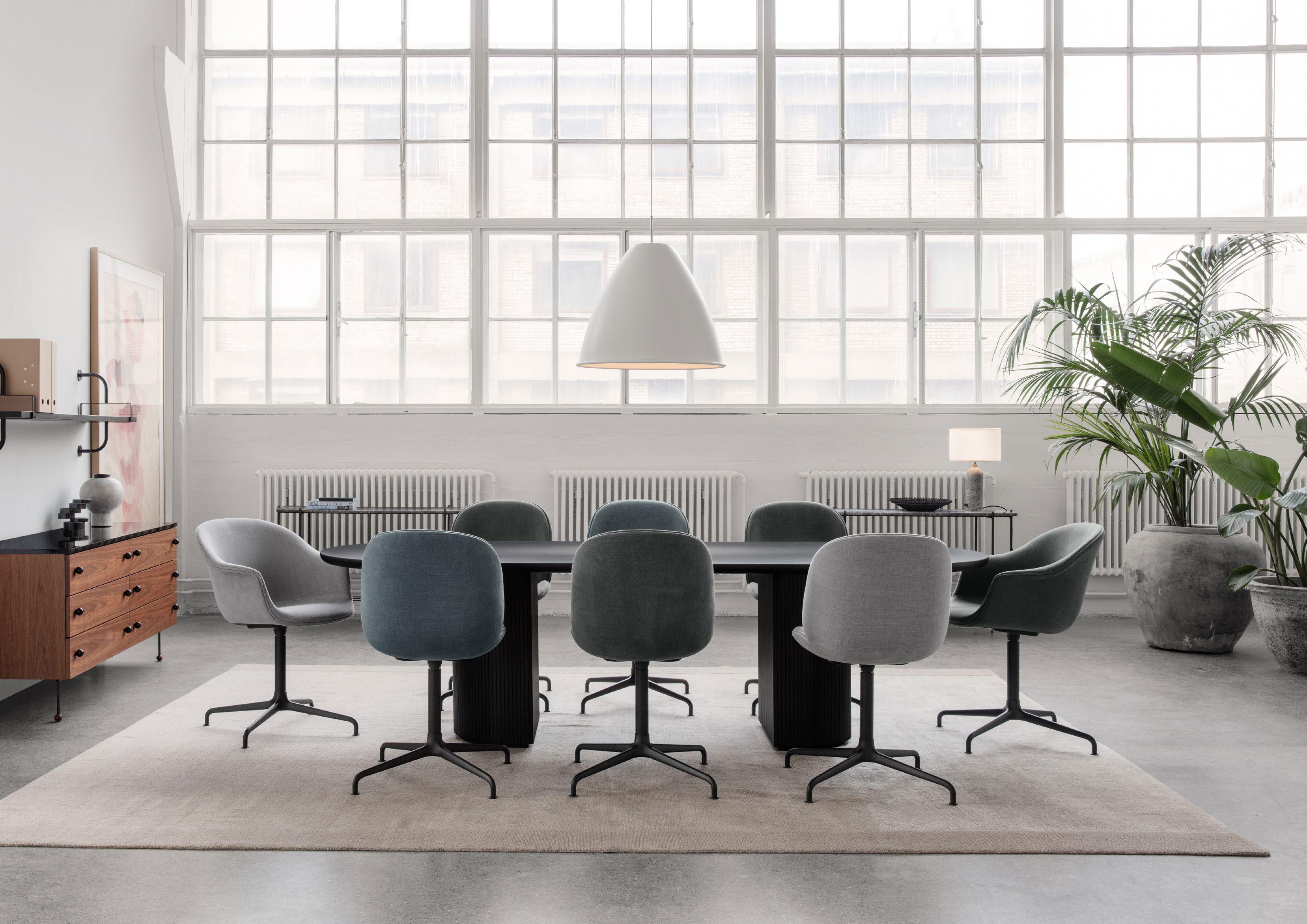 Middle and right: Beetle Height Adjustable Meeting Chair, Four-Star Castor base, fully upholstered in Kvadrat Relate 221 & Kvadrat Relate 401.