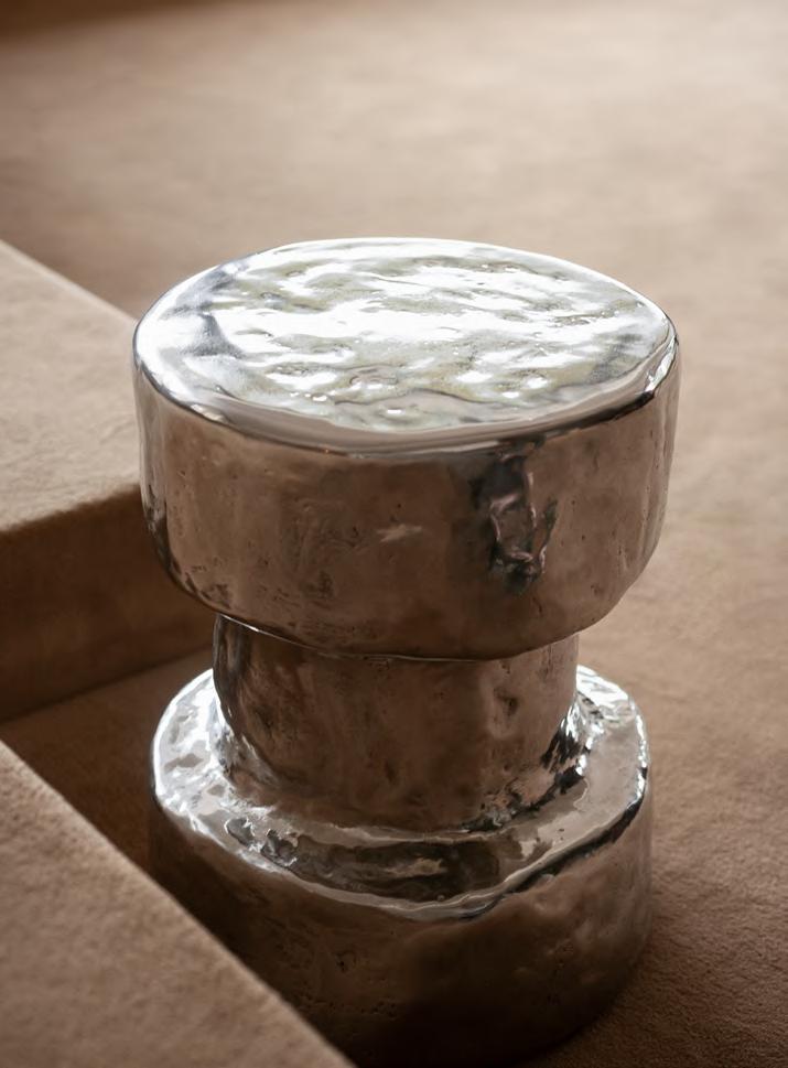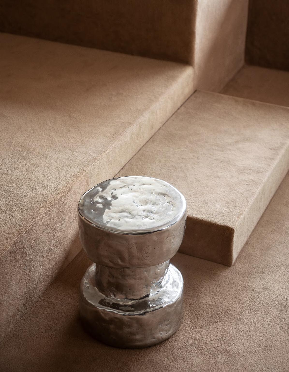 Polished Chrome, upholstery Aniline Leather col. 02. ALTAR low table by EWE Studio, 2023, finish T178 Plaster Cement.
