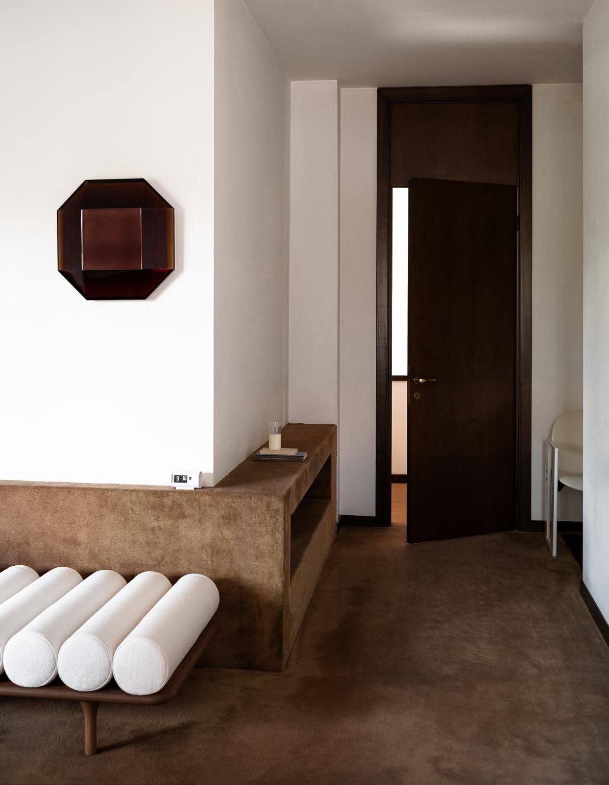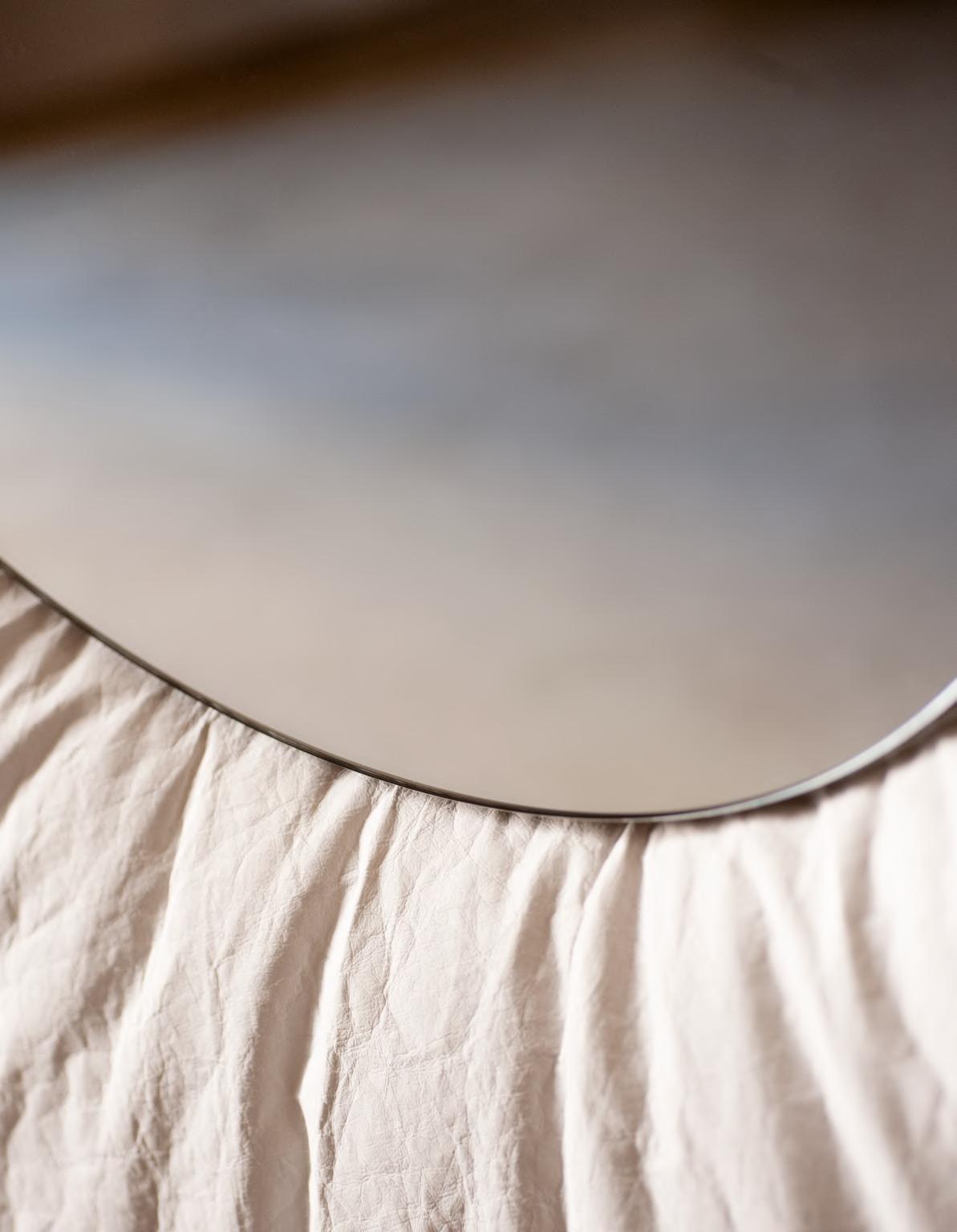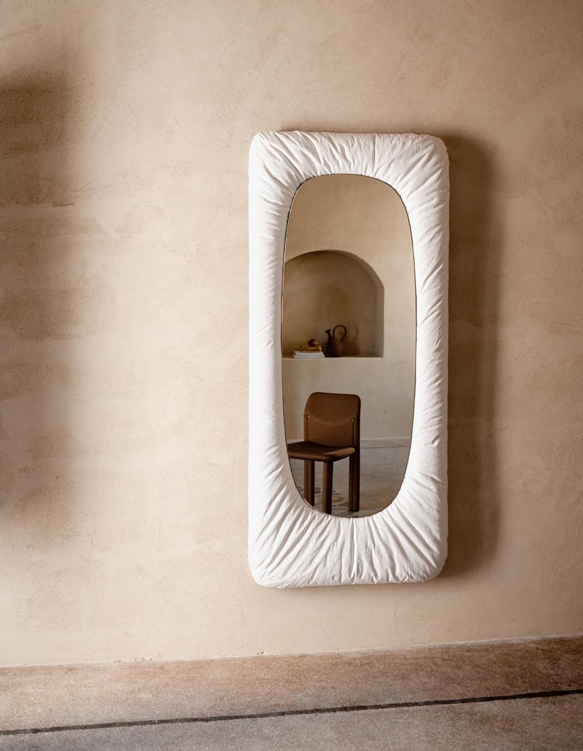 SOLAR daybed by Faye Toogood, 2024, upholstery Etere col. 13 (back) and Zurah col.01 (front). ALTAR low table by EWE Studio, 2023, finish T178 Plaster Cement. ANCORA mirror by Umberto Ballardi Ricci, 2024, finish T193 Satin Steel.