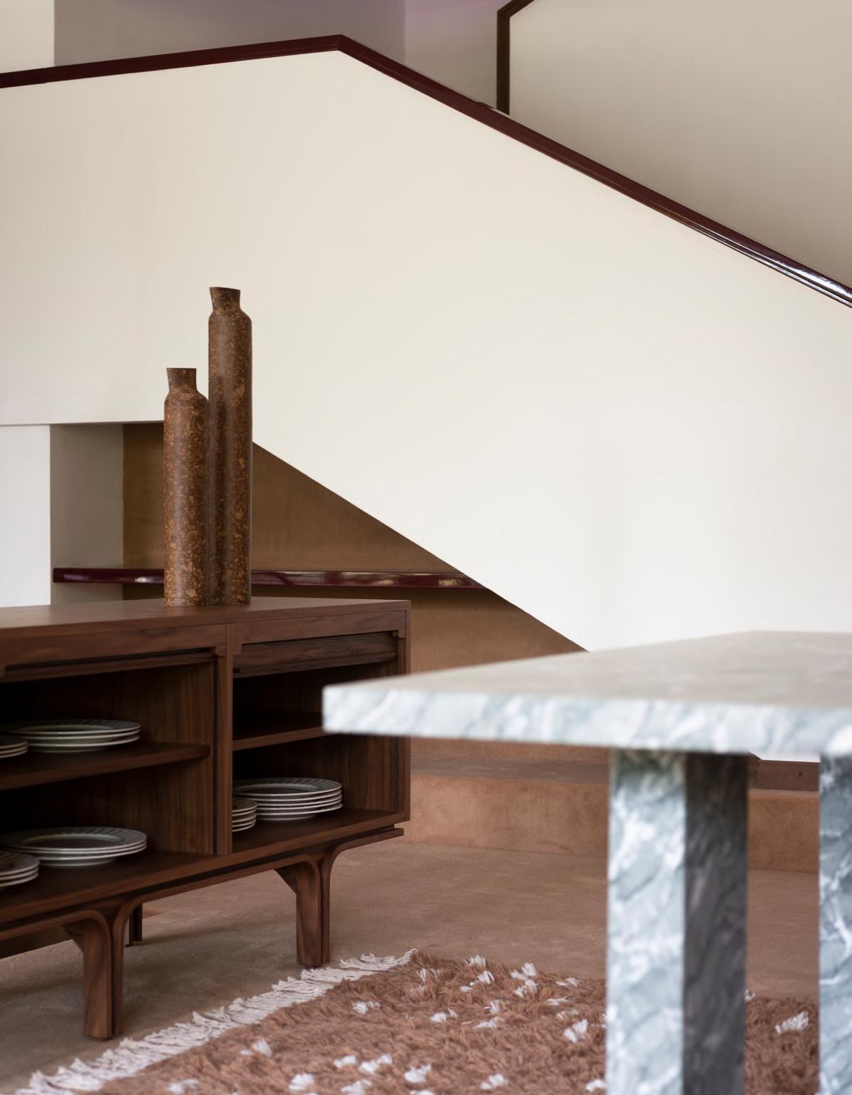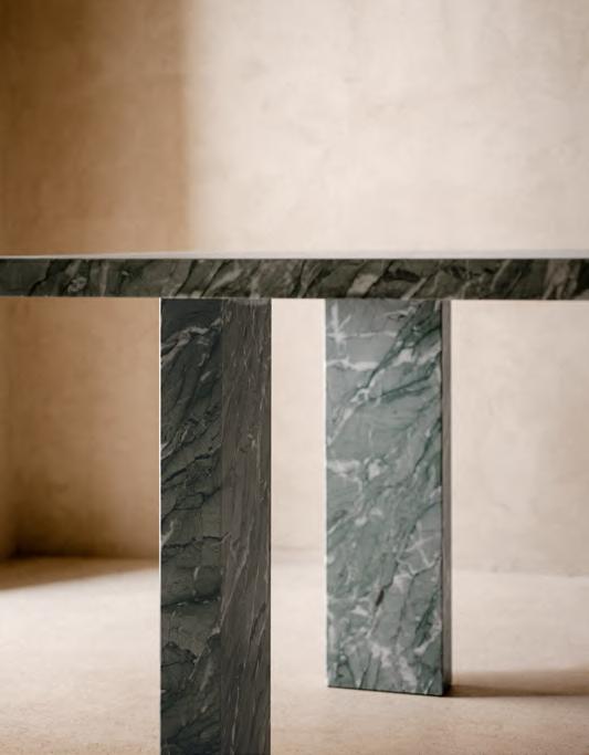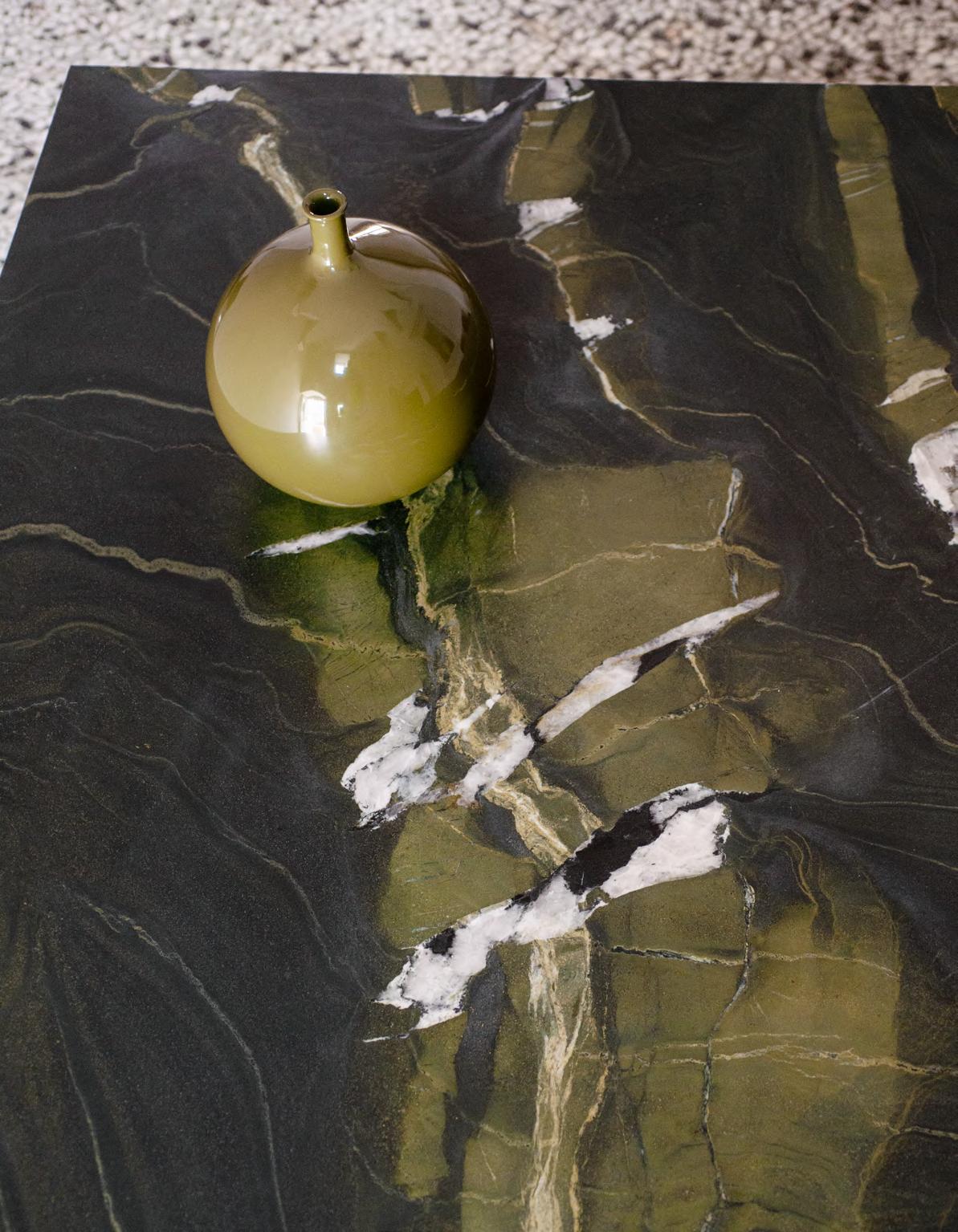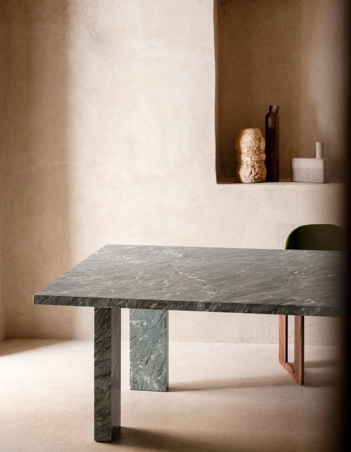 Canaletto Walnut. CLOCKWISE table by Michael Anastassiades, 2024,finish T190 Matt Mediterraneo Green Marble. MANTIQUEIRA vases by Domingos Tórtora, 2019, color Brown. JACOB rug by Salem van der Swaagh, 2024, color Caramel.