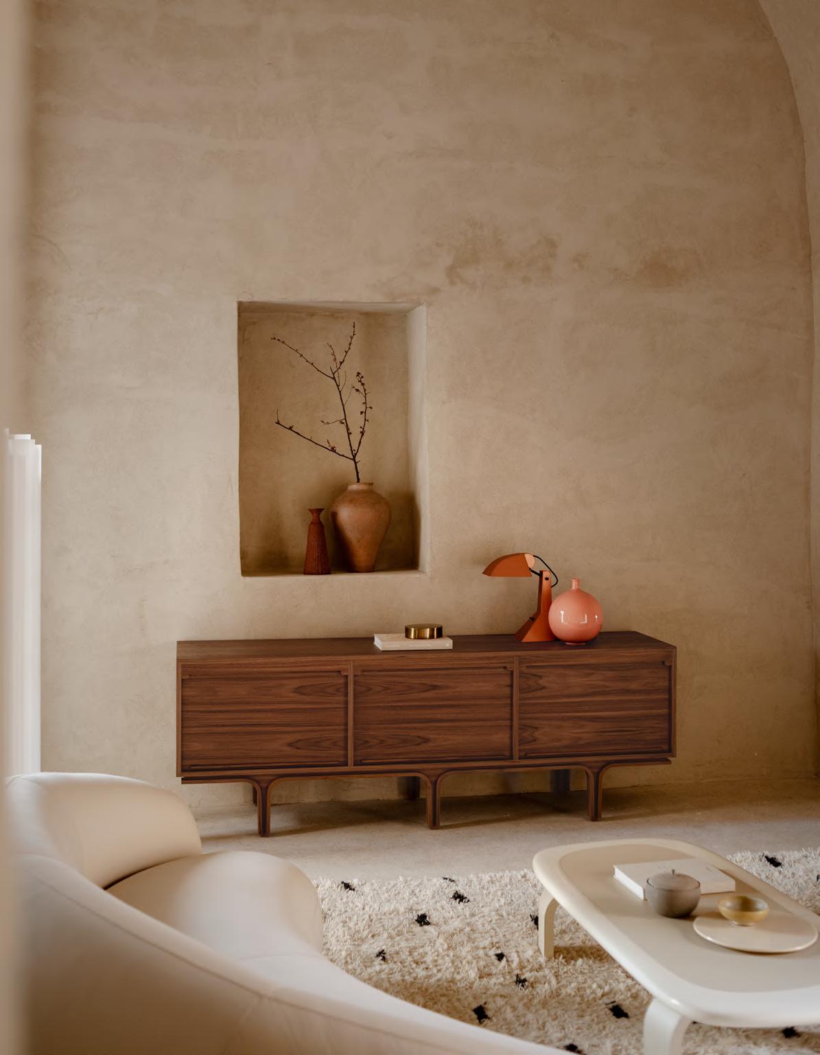 SERIE 500 Model 500/3 storage cabinet by Gianfranco Frattini, (1960) 2024, finish T135 Canaletto Walnut. ORBIT low table by Faye Toogood, 2024, Chalk mood. JULEP® sofa by Jonas Wagell, upholstery Zeus col. 01. JACOB rug by Salem van der Swaagh, 2024, color White. E63 lamp by Umberto Riva, (1963) 2017, finish T64 Brush Matt Copper. BUBBLE vase by Alvino Bagni, 2018, finish T101 Pink. FRIEDL vase by Studiopepe, 2022.
