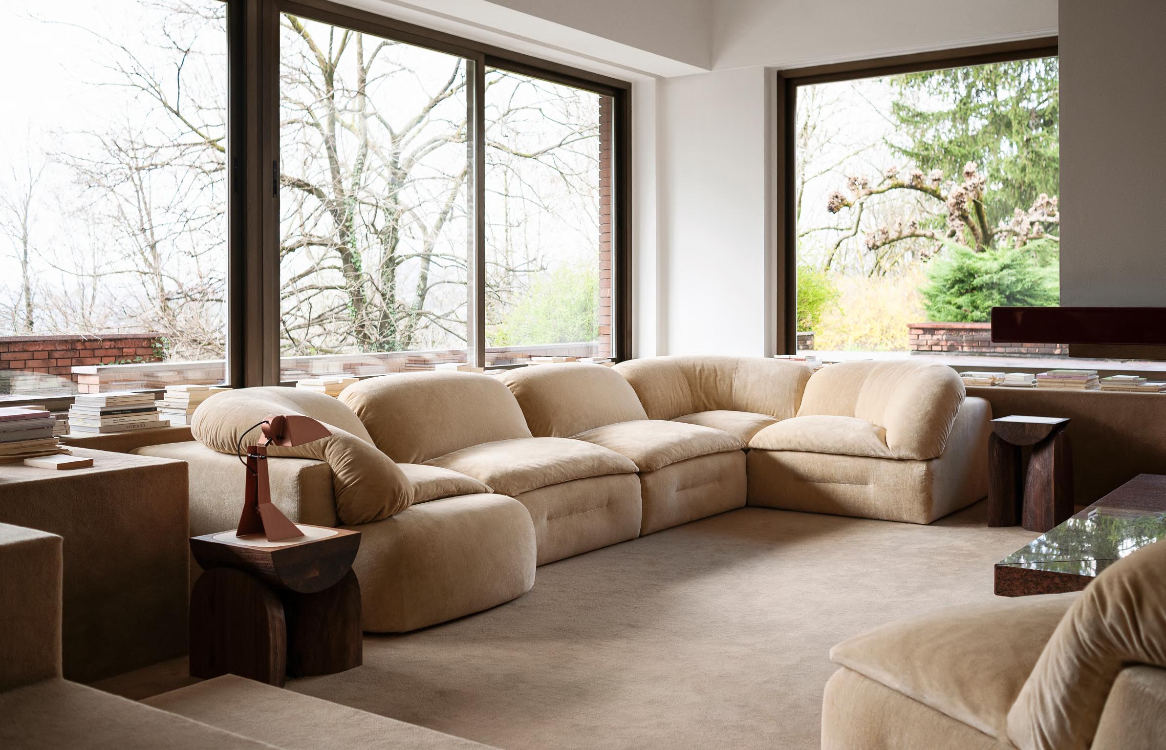 BUTTER sofa by Faye Toogood, 2025, upholstery Efeu col.02. BREAD side tables by Faye Toogood, 2025, T134 Walnut