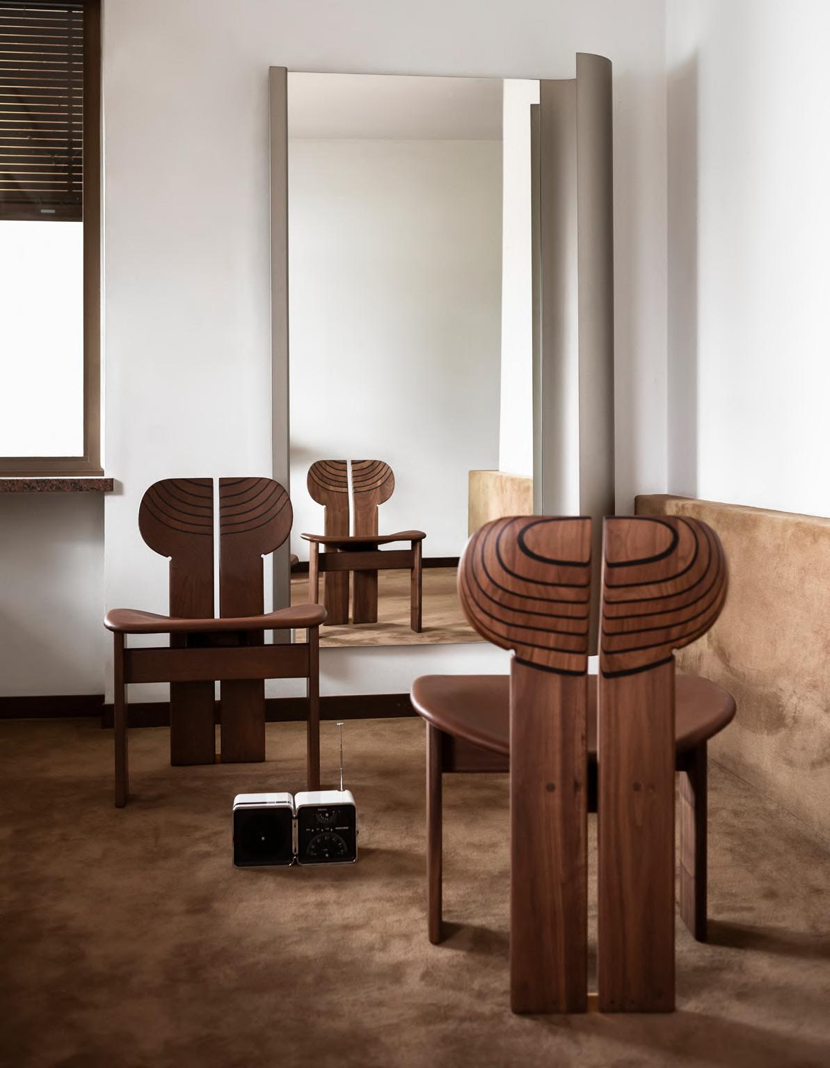 AFRICA chair by Afra and Tobia Scarpa, (1975) 2025, finish T135 Canaletto Walnut, upholstery Anilina col. 02. ANCORA mirror by Umberto Ballardi Ricci, 2024, finish T193 Satin Steel.