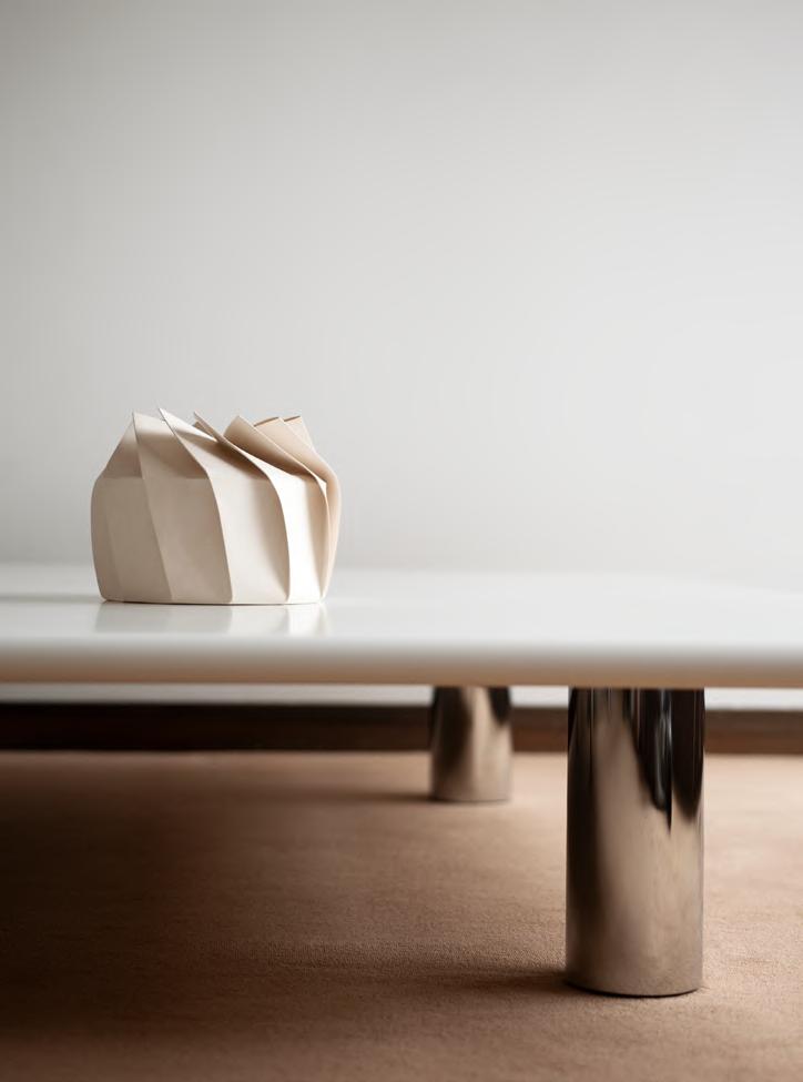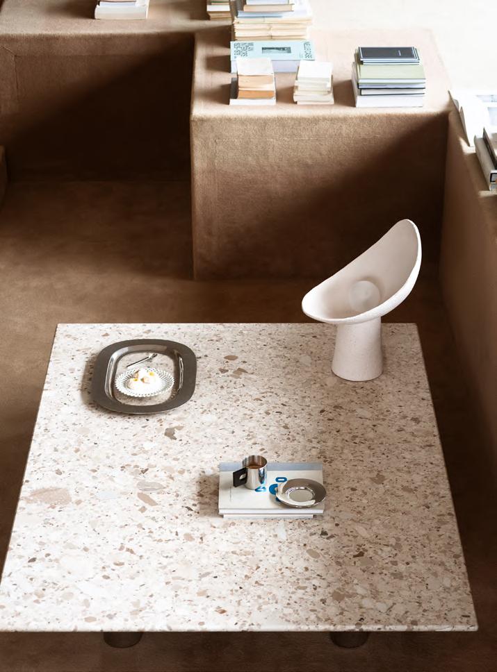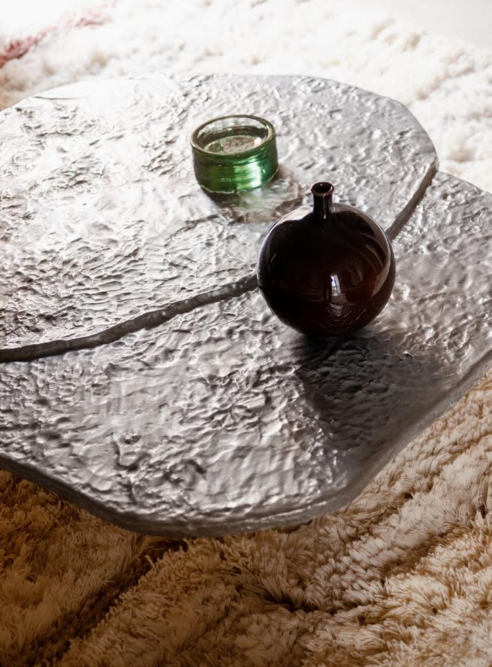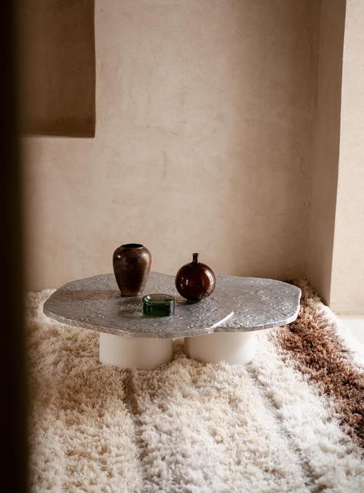 BRUT low table by Roberto Sironi, 2024, structure White Cement, top Aluminum. BUBBLE vase H 24 by Alvino Bagni, 2018, finish T98 Brown, KUSCHEL rug by Salem van der Swaagh, 2023, color White.