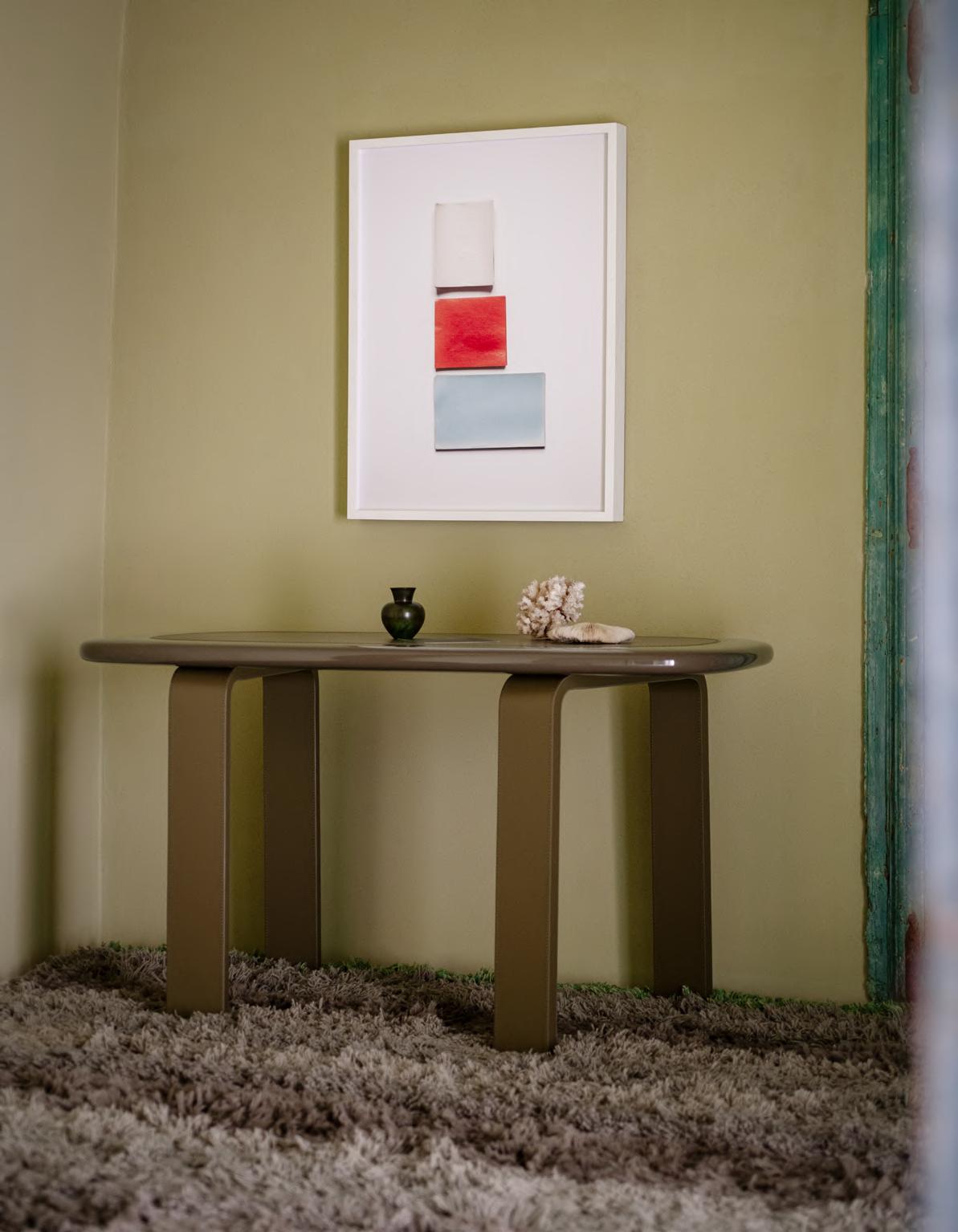 ORBIT desk by Faye Toogood, 2024, Green mood. KUSCHEL rug by Salem van der Swaagh, 2023, color Grey.