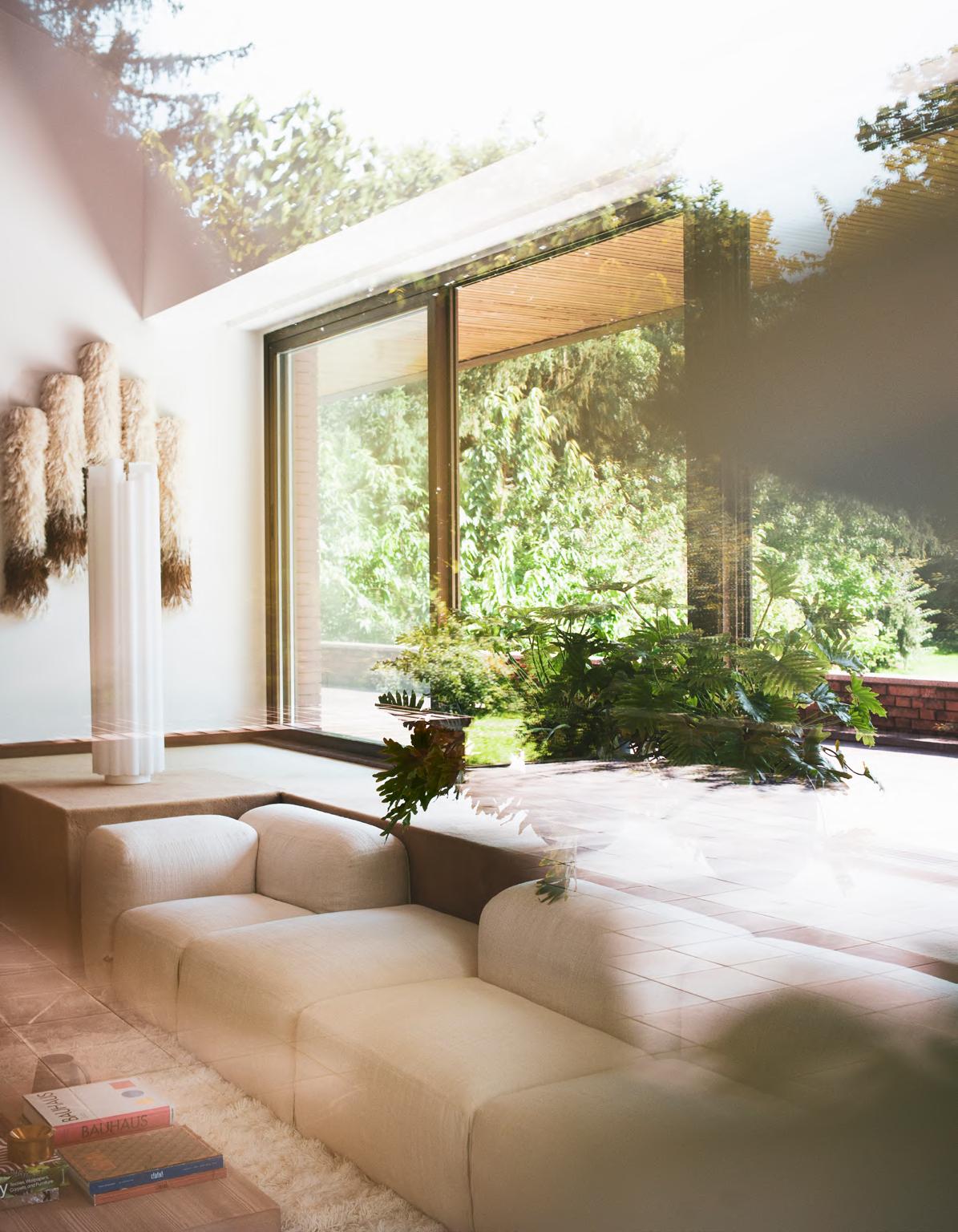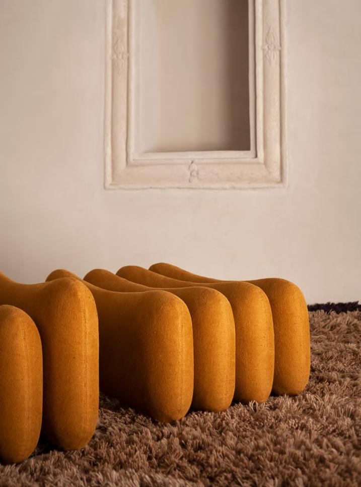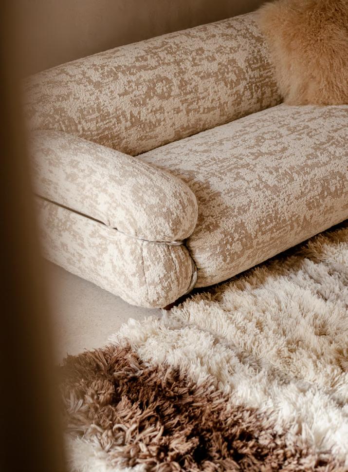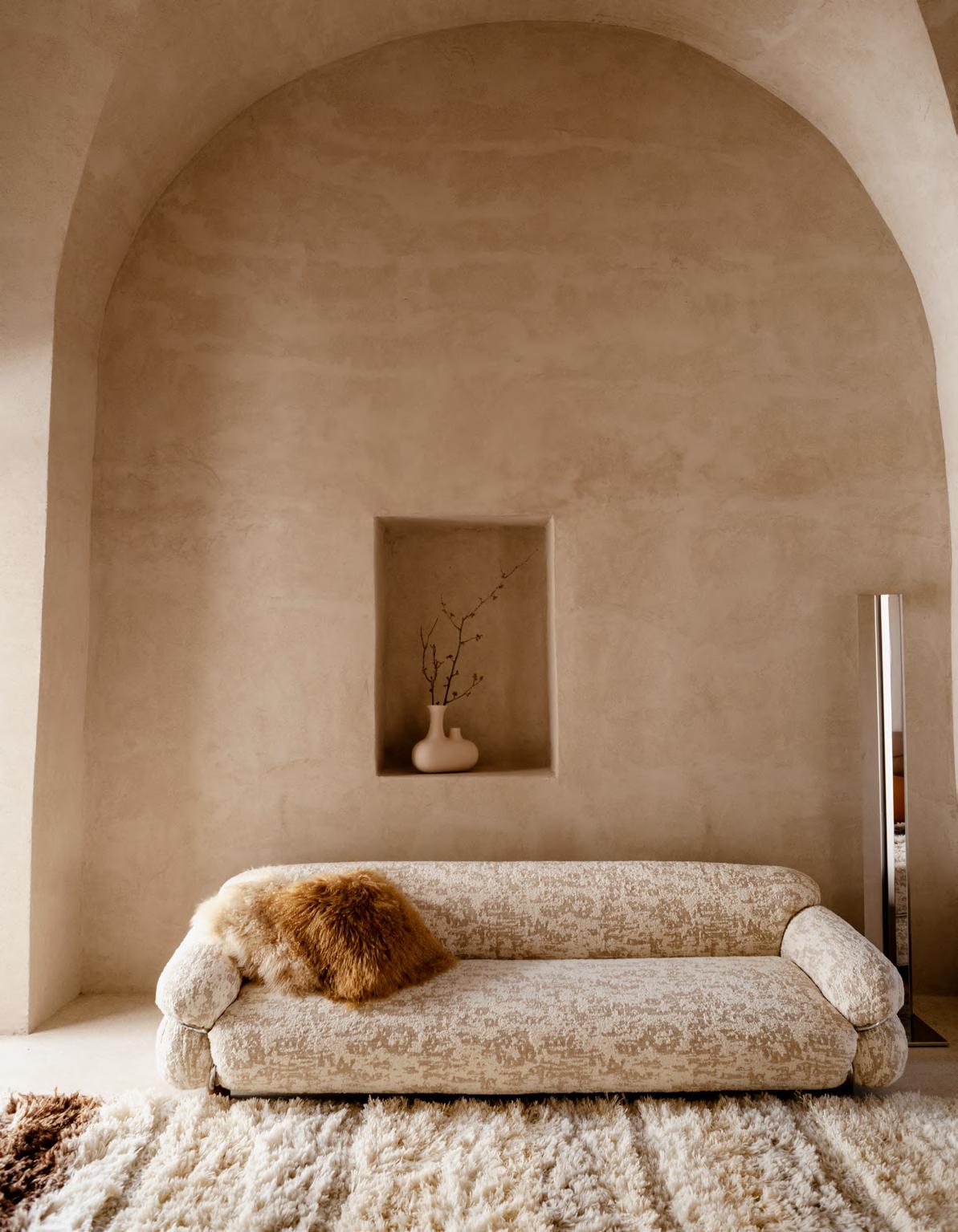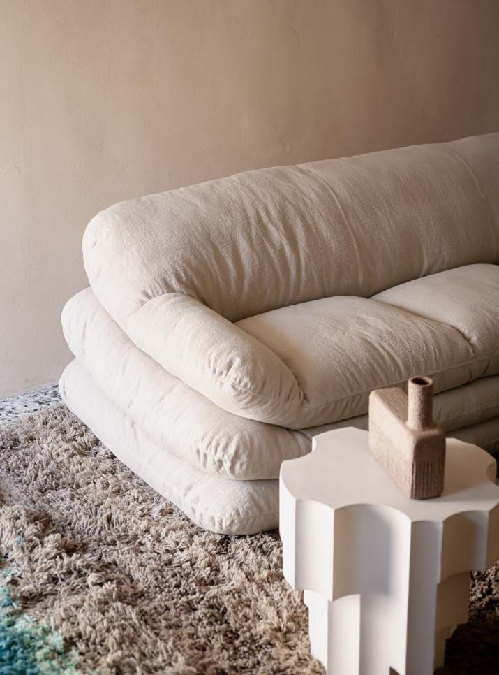 SOLAR sofa by Faye Toogood, 2024, upholstery Zurah col. 04. BRUT low table by Roberto Sironi, 2024, White Cement structure, Aluminum top. MANTIQUEIRA vases by Domingos Tórtora, 2019, color Beige. KUSCHEL rug by Salem van der Swaagh, 2023, color White.