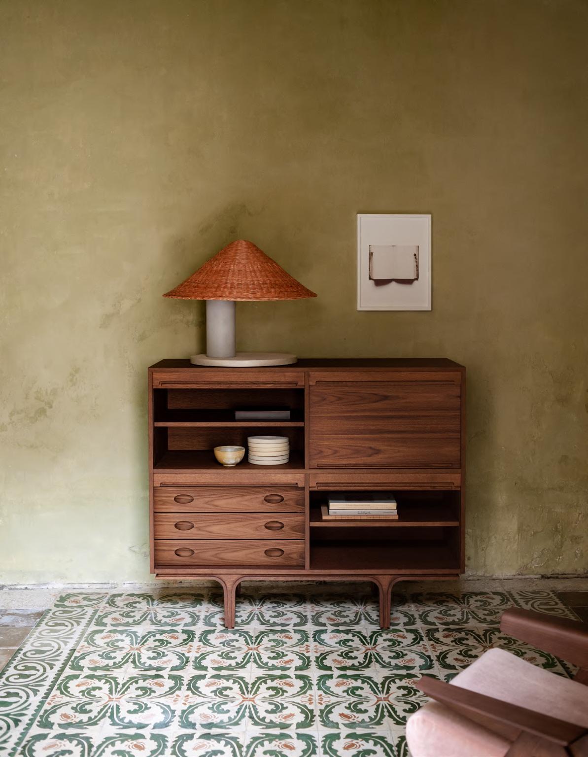 SERIE 500 Model 500/4 storage cabinet by Gianfranco Frattini, (1960) 2024, finish T135 Canaletto Walnut. LINA armchair by Gianfranco Frattini, (1955) 2018, base T43 Dark Walnut Stained ALMA lamp by Studiopepe, 2022.