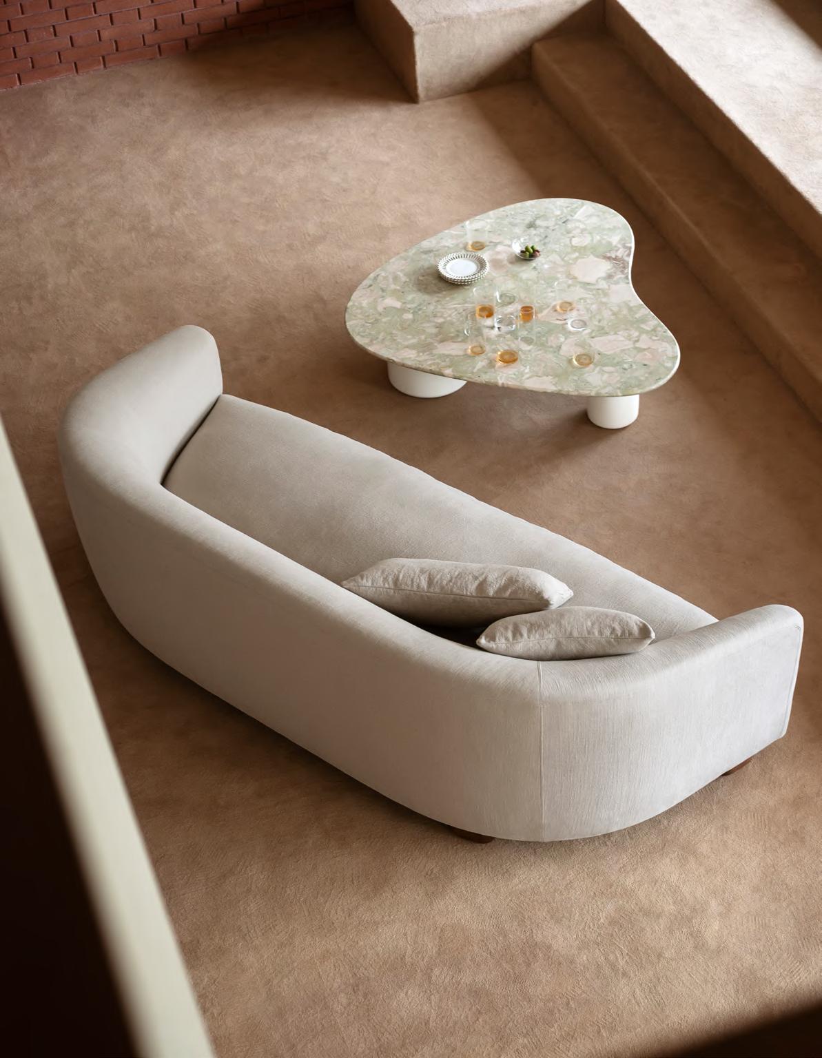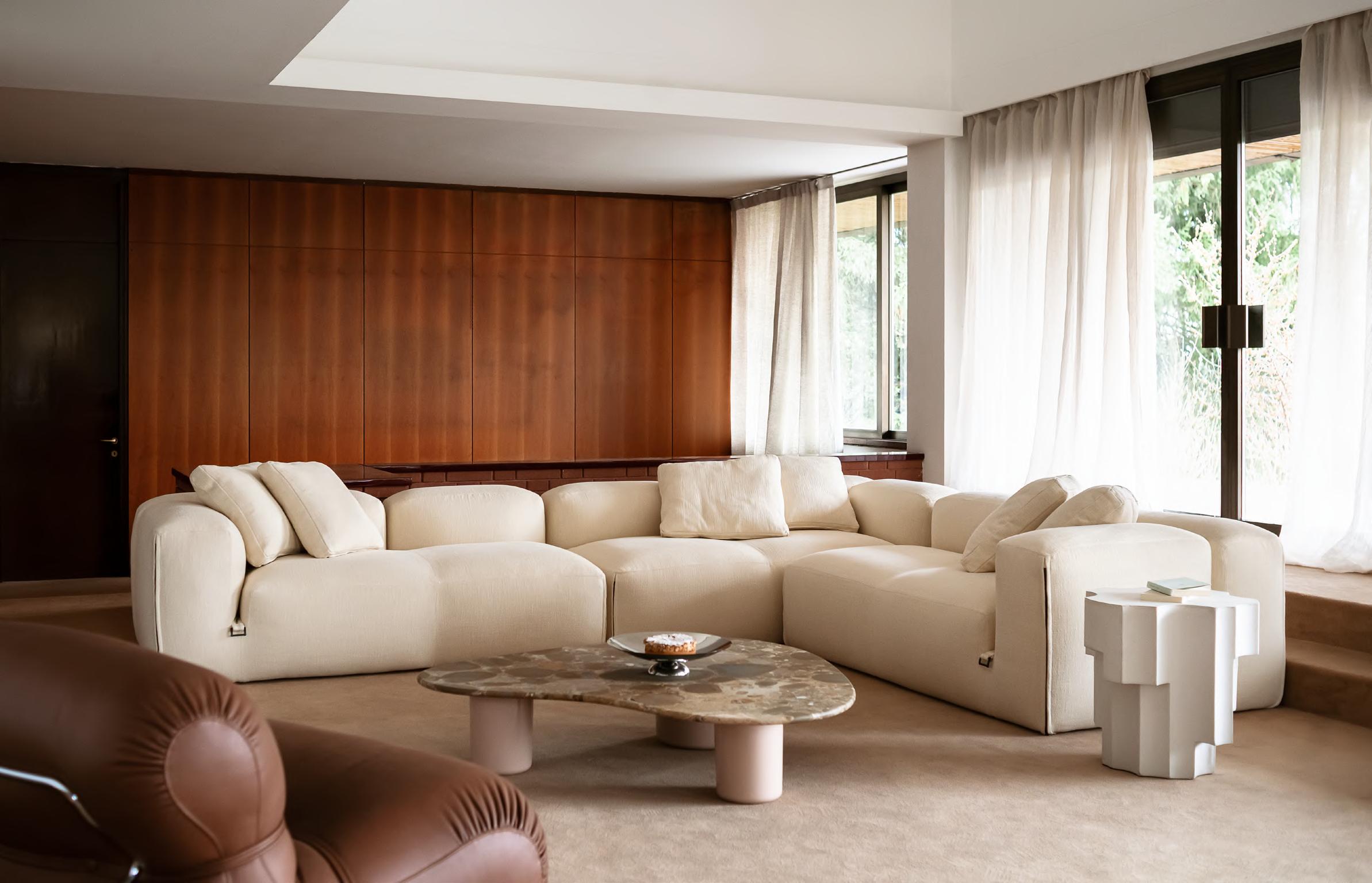 ROMA NUVOLA sofa by Jonas Wagell, 2023, upholstery Tuna col. 02. GIAN low table by Studiopepe, 2025, T198 Glossy Lacquered White concrete base, T211 Brushed Sicilian Breccia Marble top.