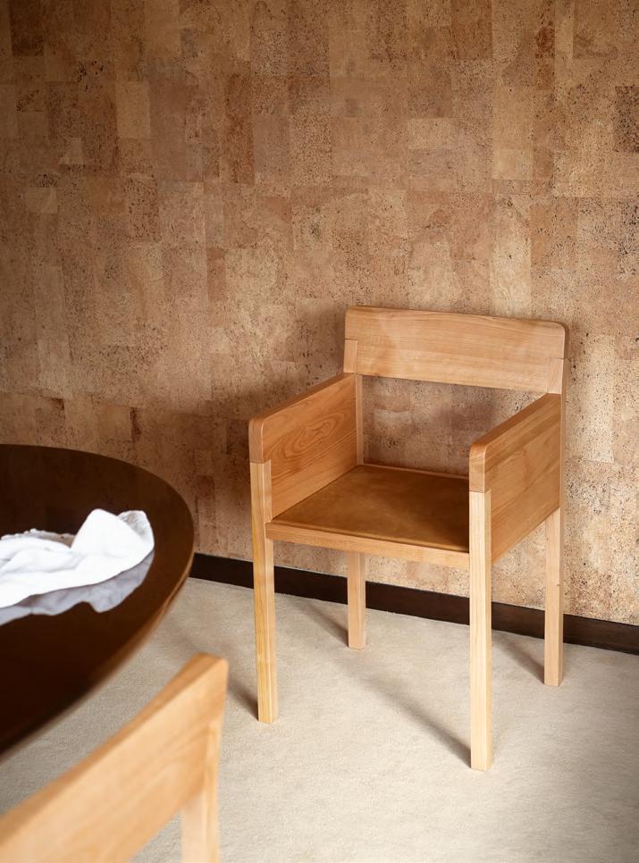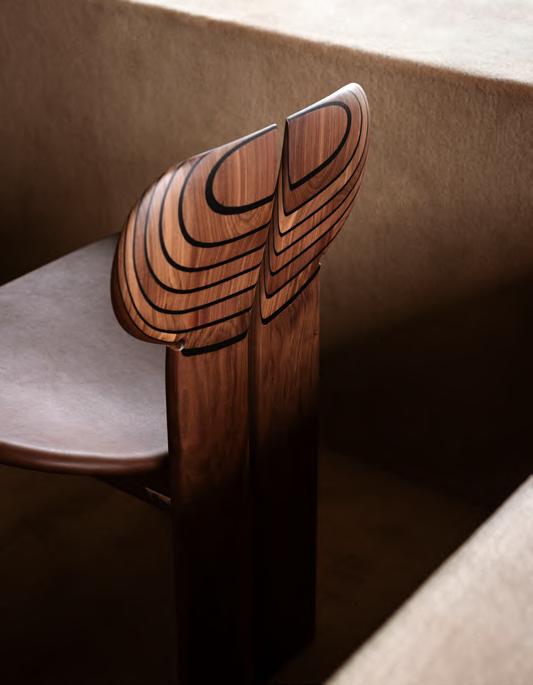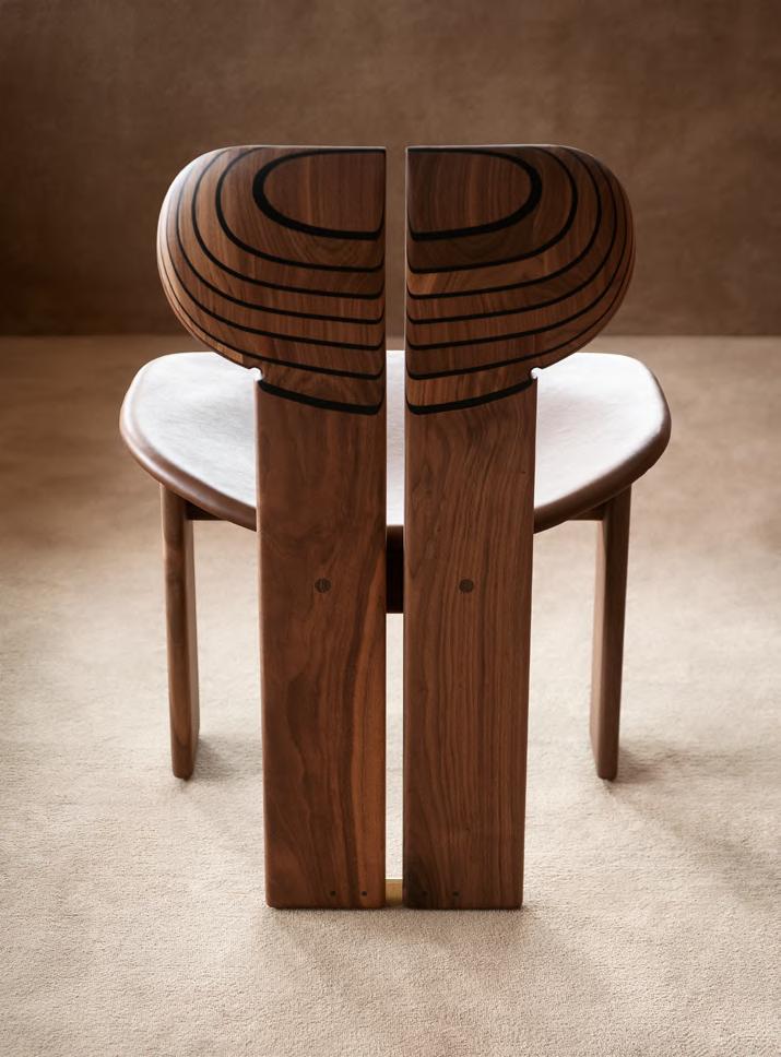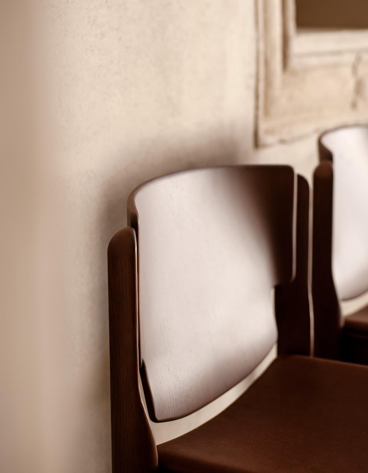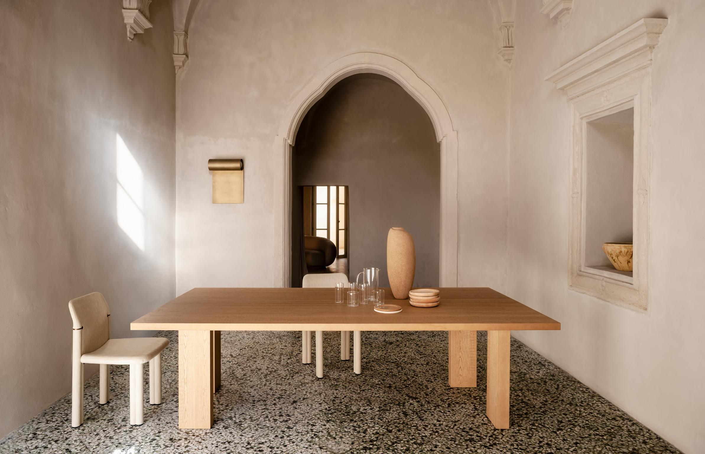 KLOTSKI chair by Michael Anastassiades, 2025, finish T205 Natural Stained Cherry, upholstery Zahir col. 14. TORII LOVE dining table by Studiopepe, 2025, finish T202 Lacquered Wood Chocolate.
