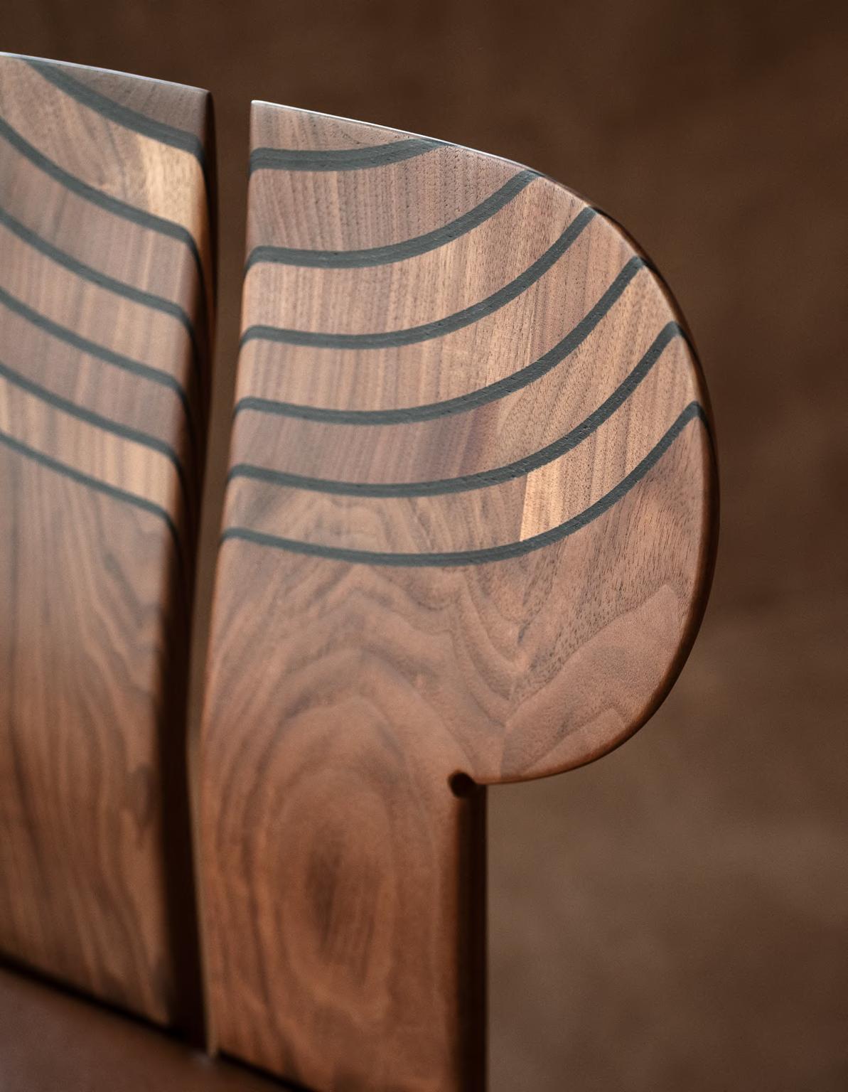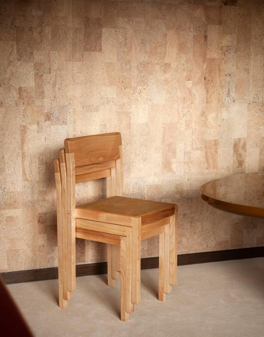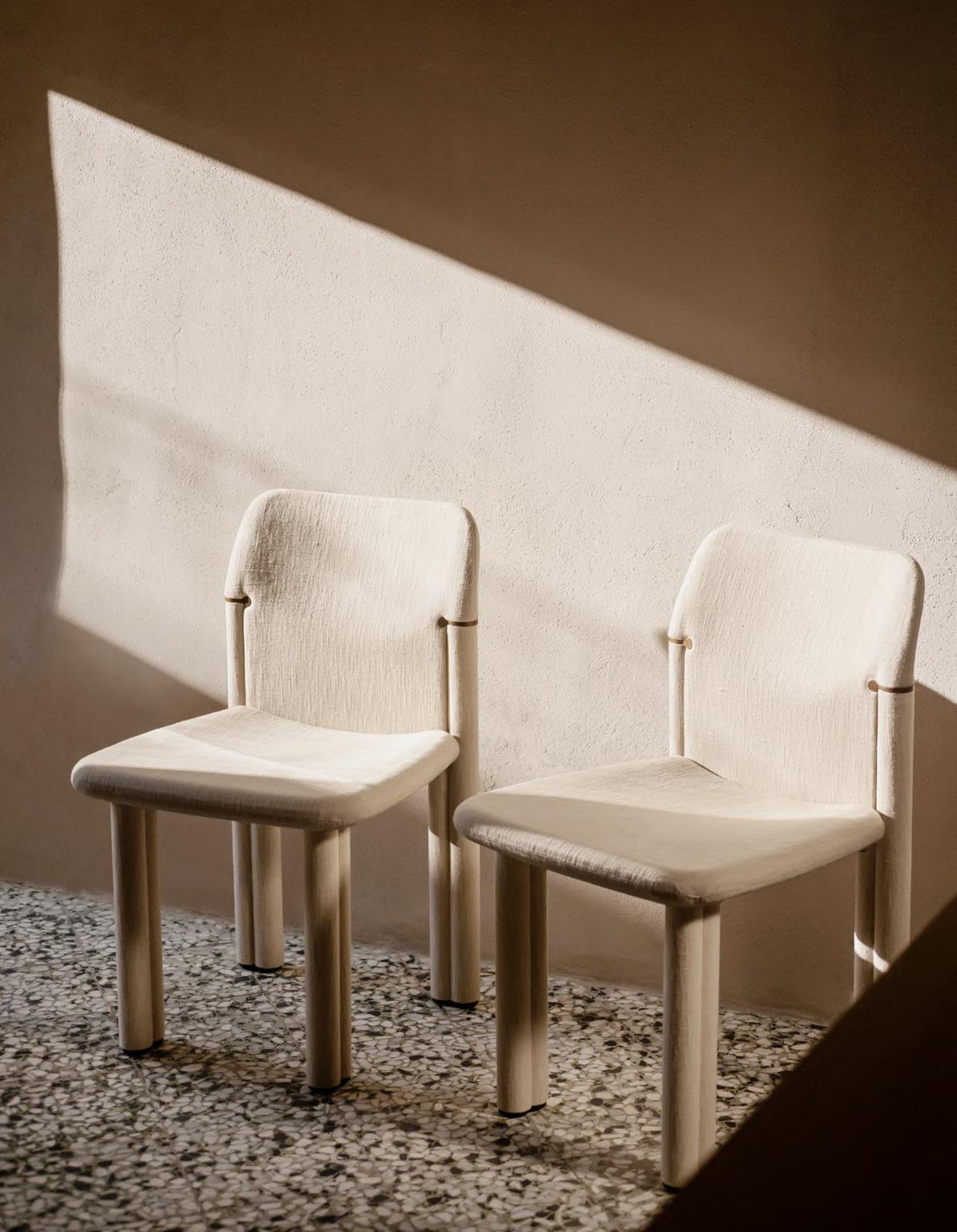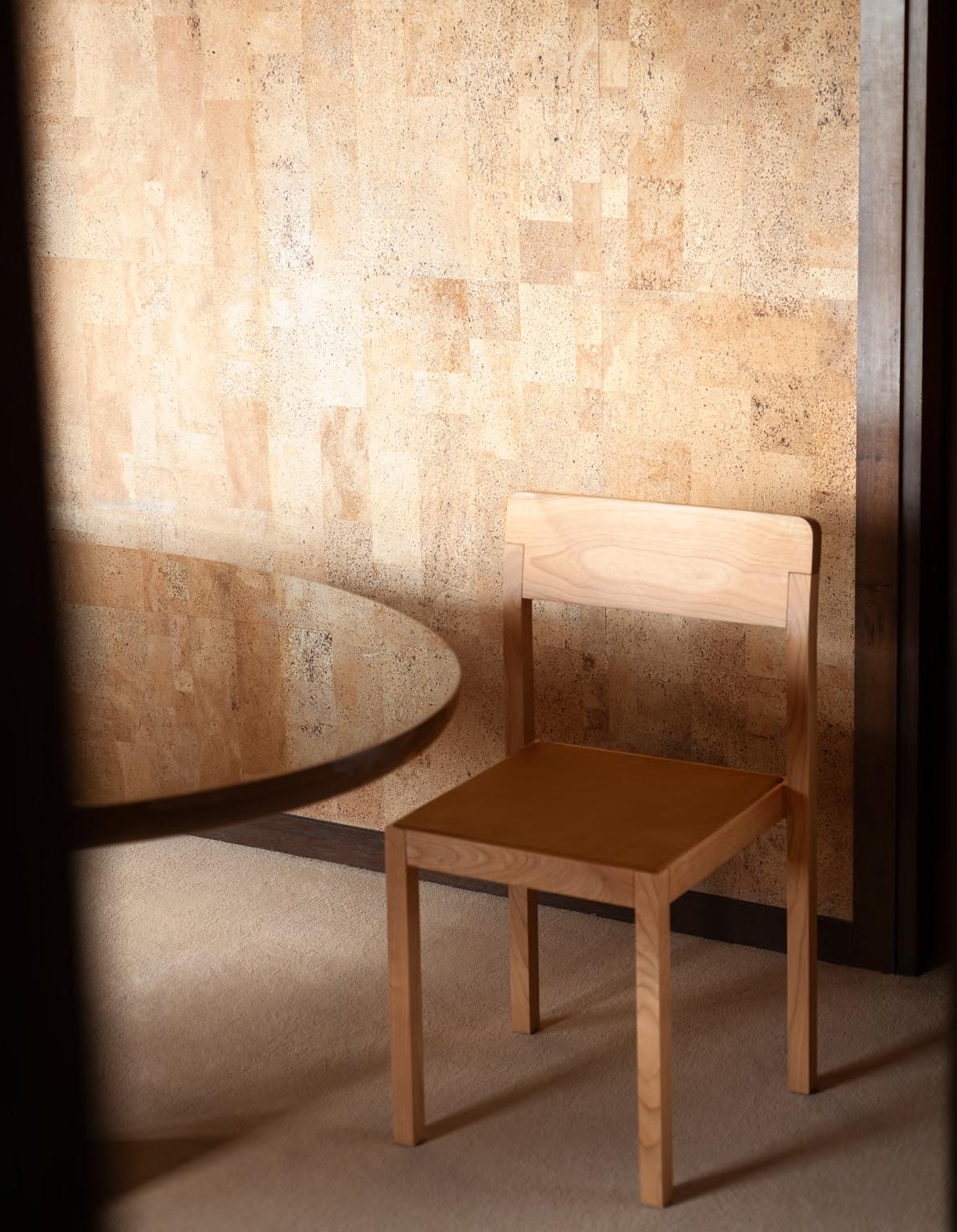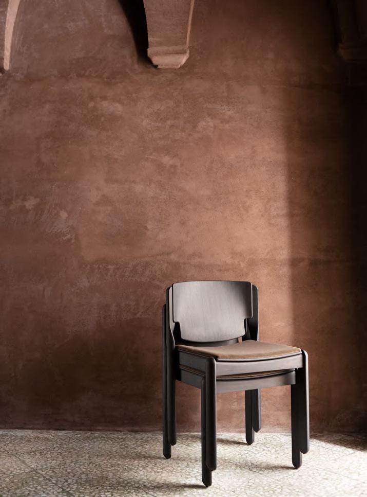 KLOTSKI chair by Michael Anastassiades, 2025, finish T205 Natural Stained Cherry, upholstery Zahir col. 14. TORII LOVE dining table by Studiopepe, 2025, finish T202 Lacquered Wood Chocolate.