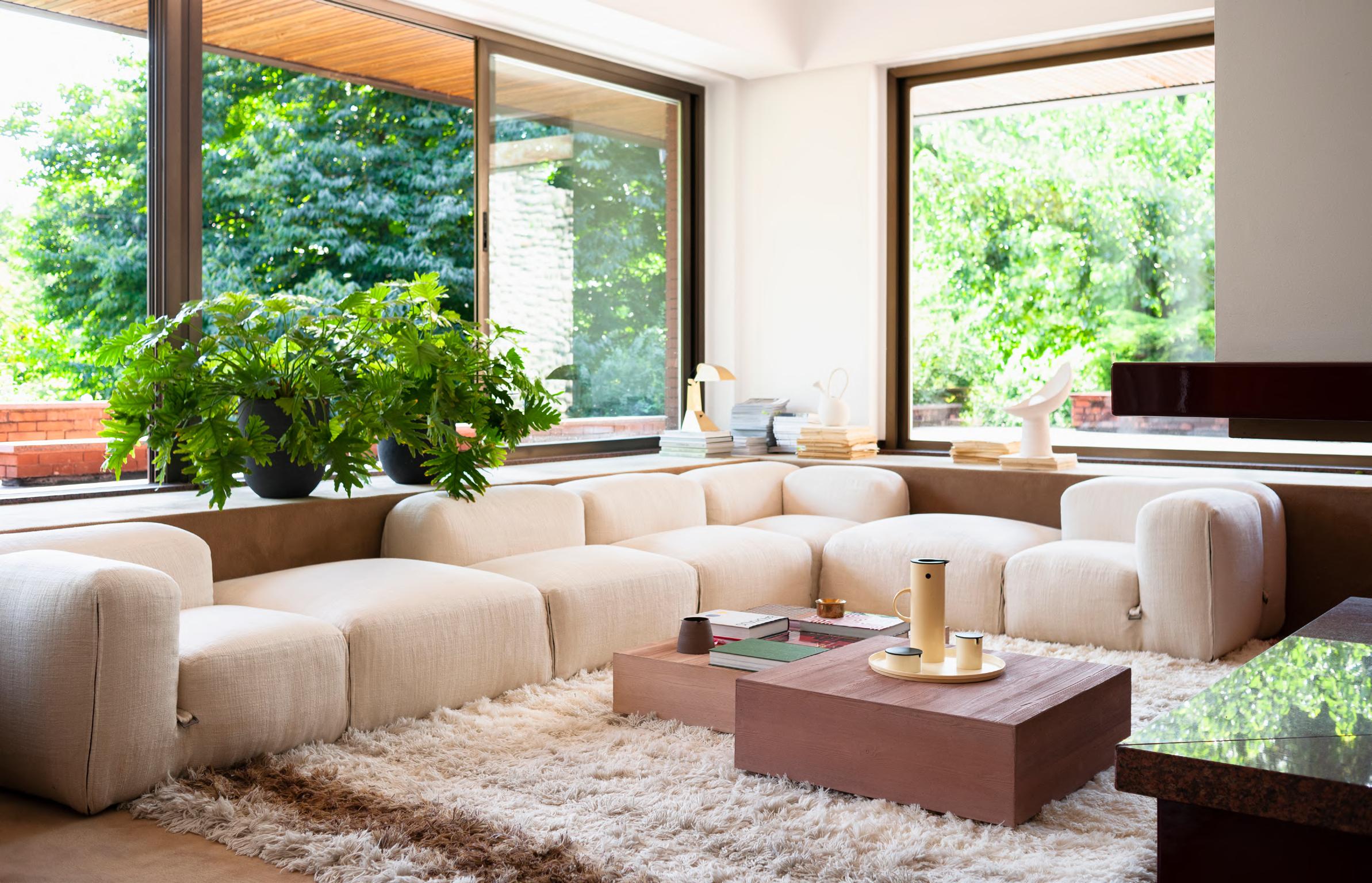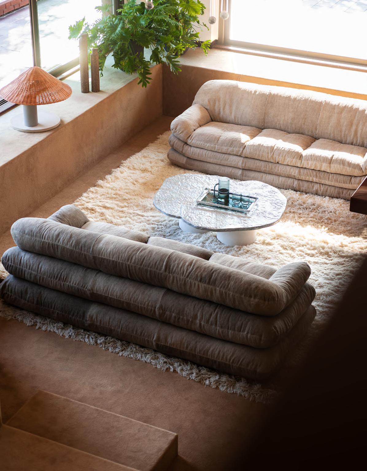 SOLAR sofa by Faye Toogood, 2024, upholstery Zurah col. 03 and col. 04. BRUT low table by Roberto Sironi, 2024, White Cement structure, Aluminum top. ALMA lamp by Studiopepe, 2022. MANTIQUEIRA vases by Domingos Tórtora, 2019, color Brown. KUSCHEL rug by Salem van der Swaagh, 2023, color White.