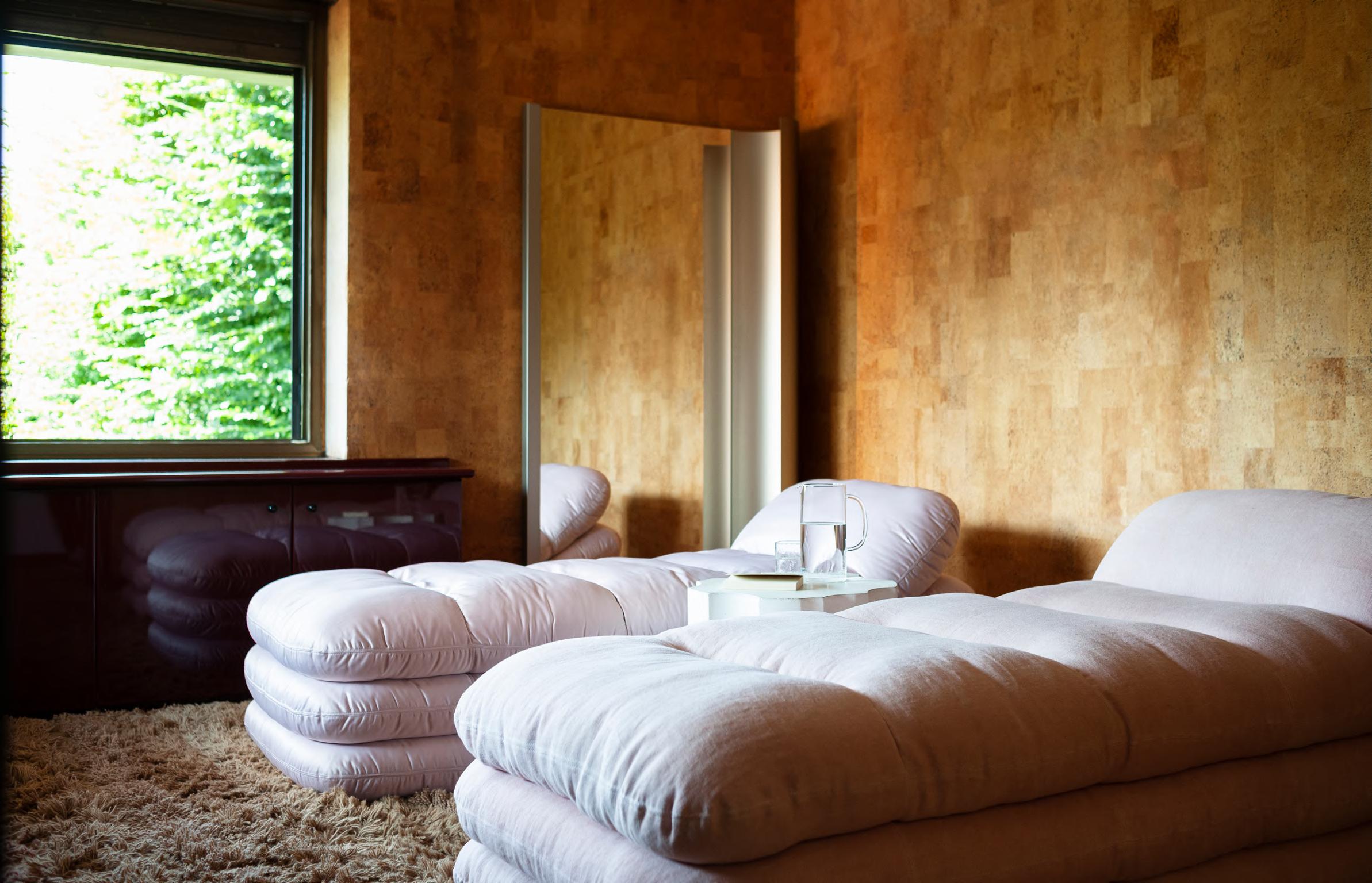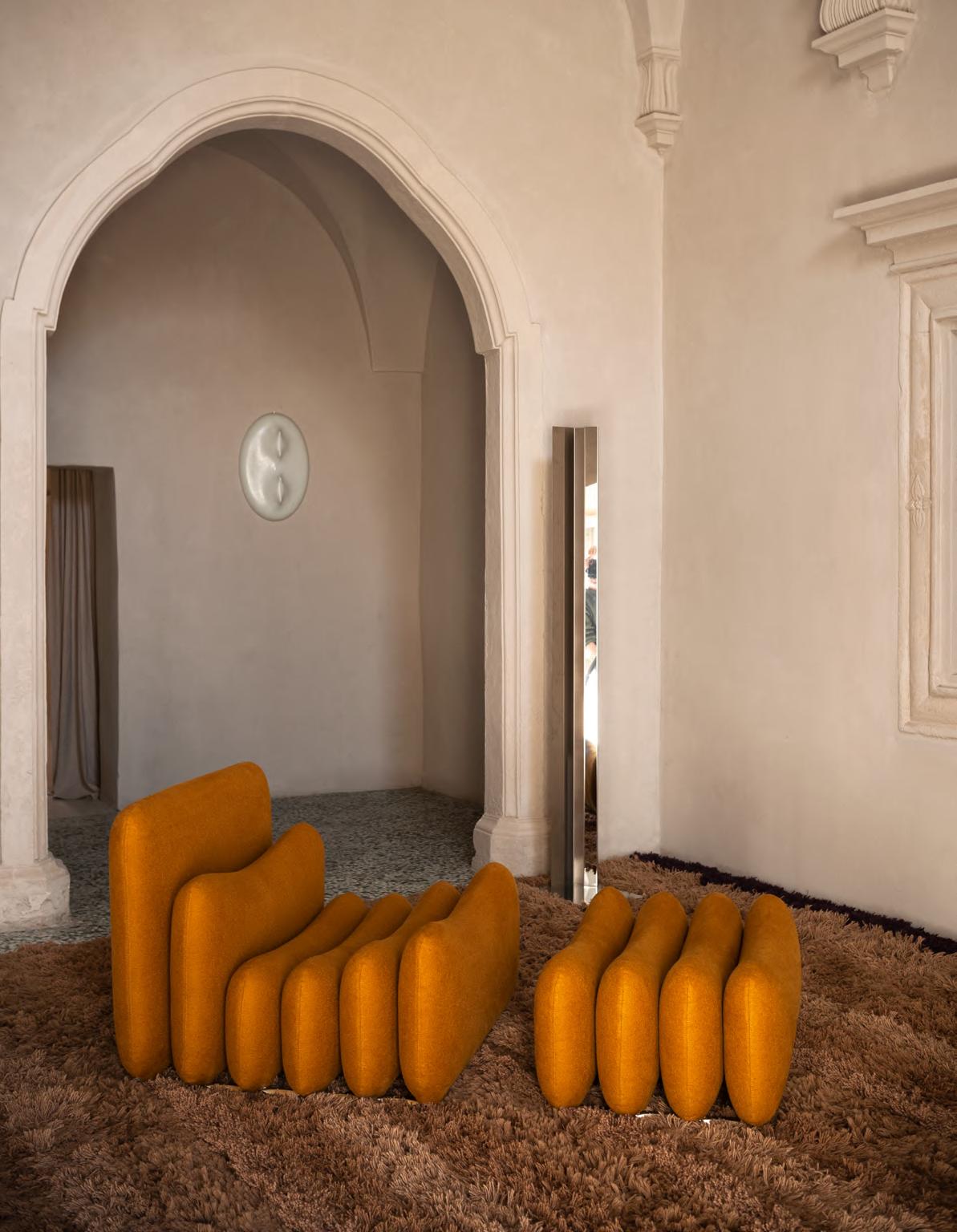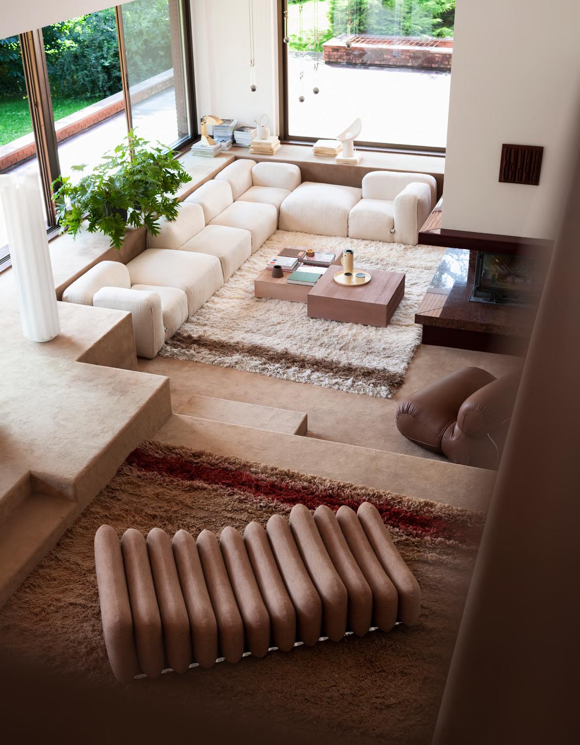 ADDITIONAL SYSTEM armchair and ottoman by Joe Colombo, (1967) 2024, upholstery Tuna col. 05. SOLSTICE lamp by Studiopepe, 2023, color White. MANO LIGHT floor lamp by Umberto Bellardi Ricci 2023, structure T23 Polished Chrome KUSCHEL rug by Salem van der Swaagh, 2023, color Caramel.