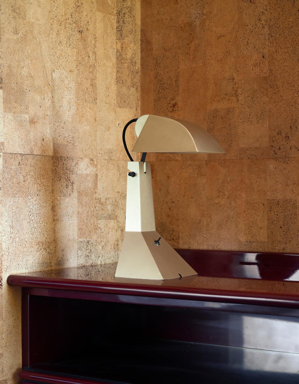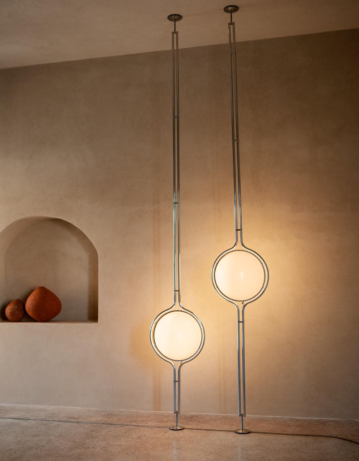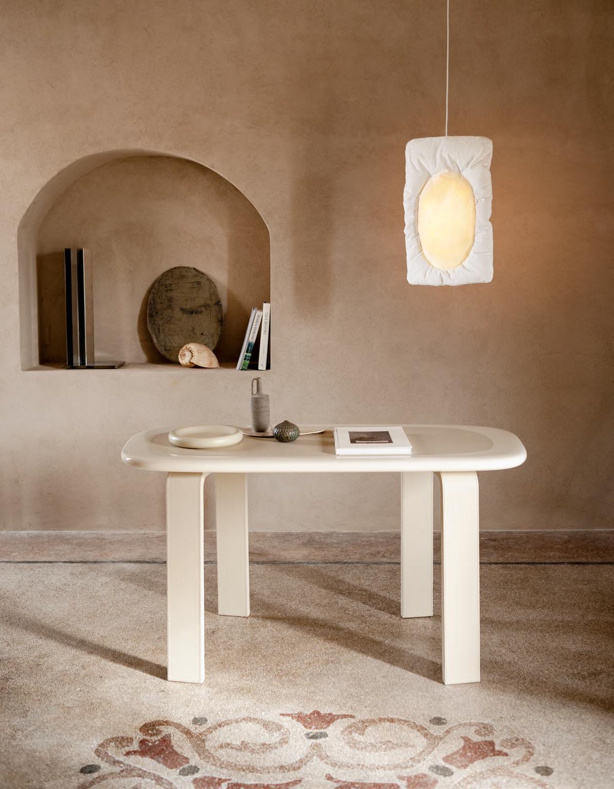 ORBIT desk/low table by Faye Toogood, 2024, Chalk mood. LUNAR S lamp by Faye Toogood, 2024. MANO LIGHT table lamp by Umberto Bellardi Ricci, 2023, structure T23 Polished Chrome.