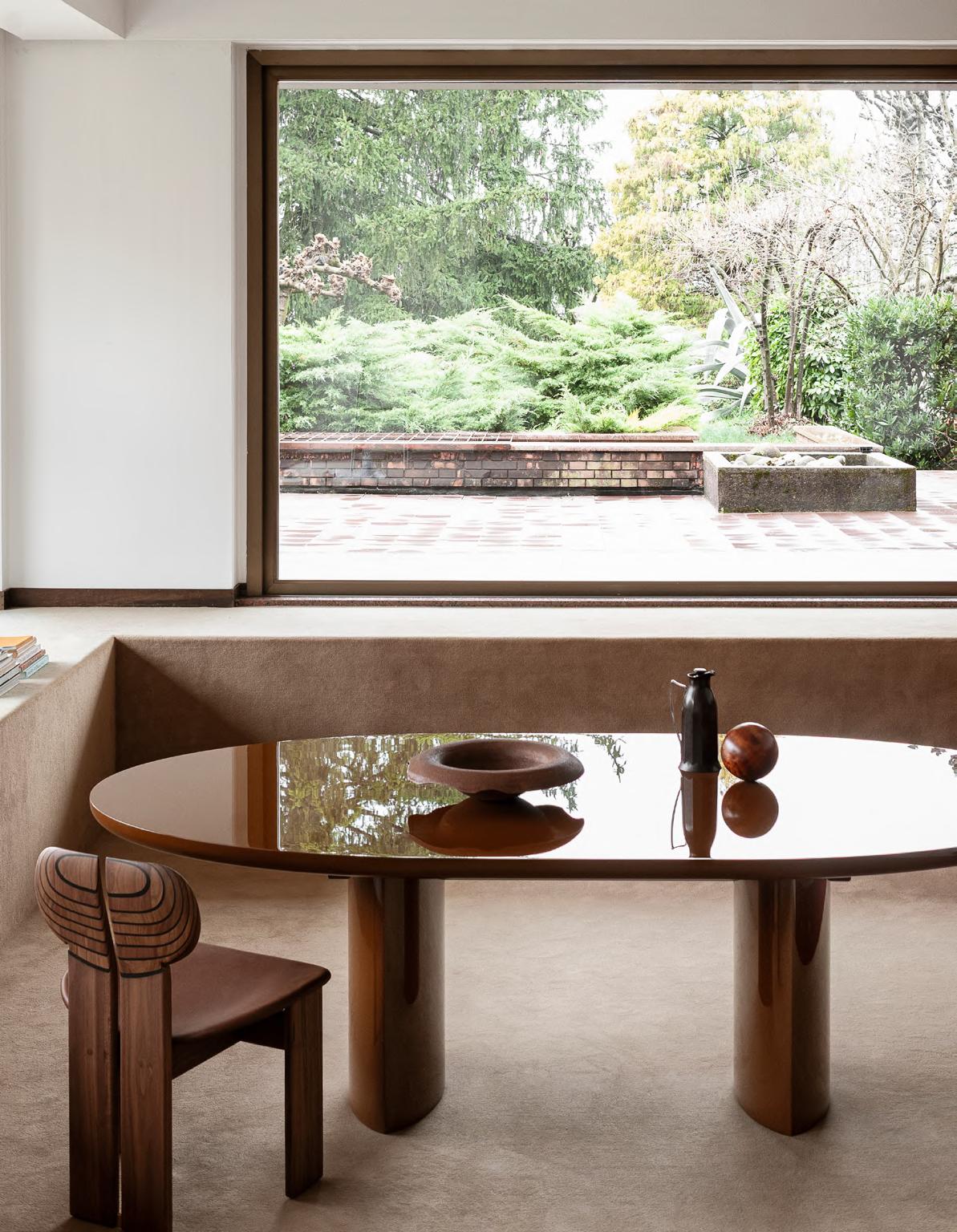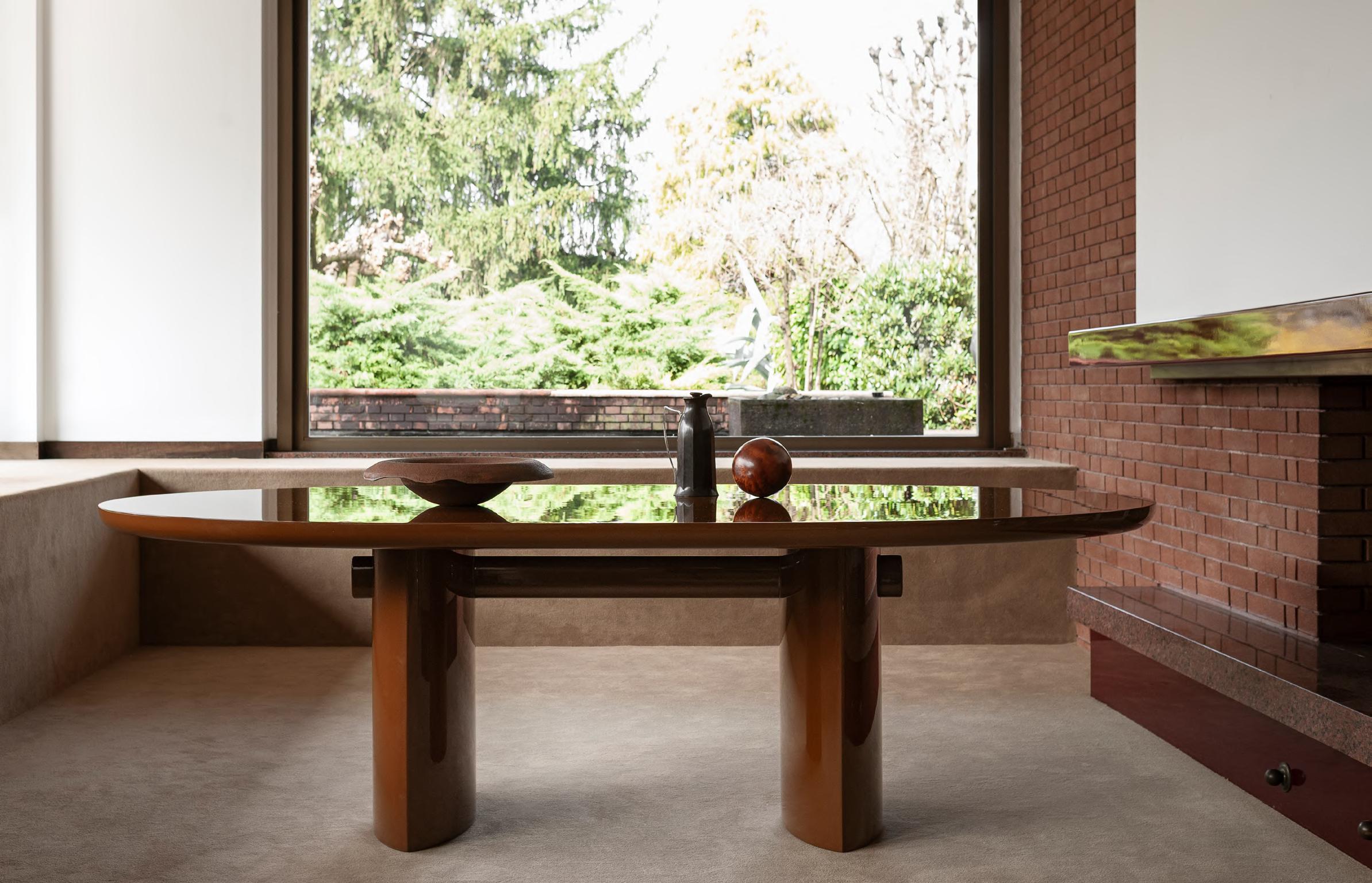 TORII LOVE dining table by Studiopepe, 2025, finish T202 Lacquered Wood Chocolate. AFRICA chair by Afra and Tobia Scarpa, (1975)