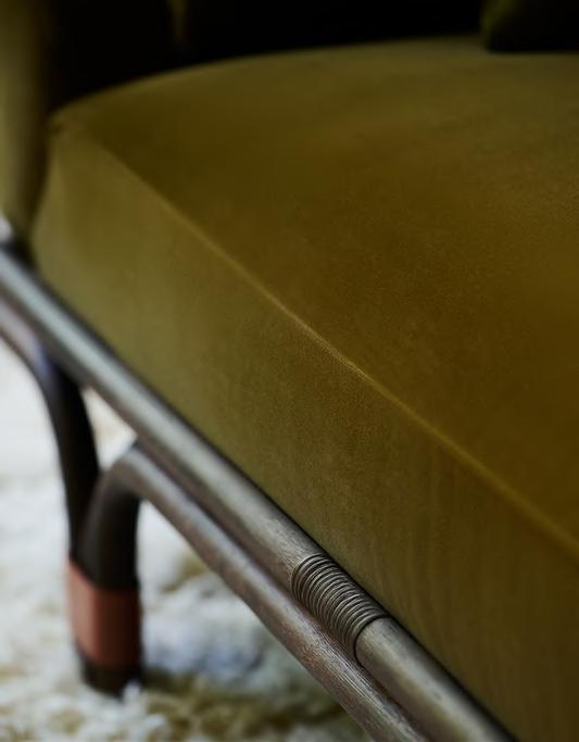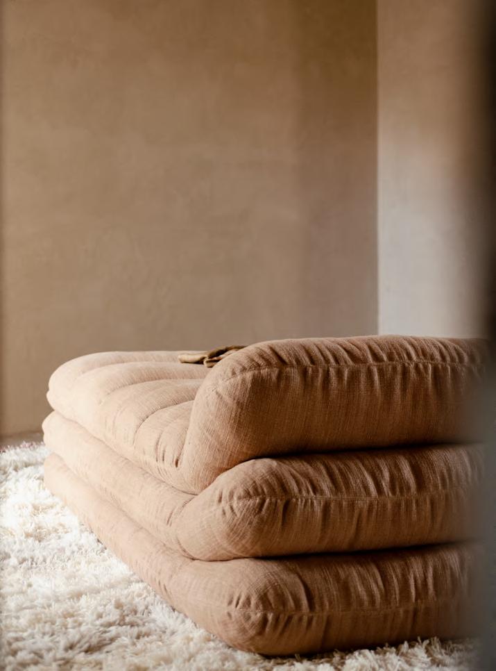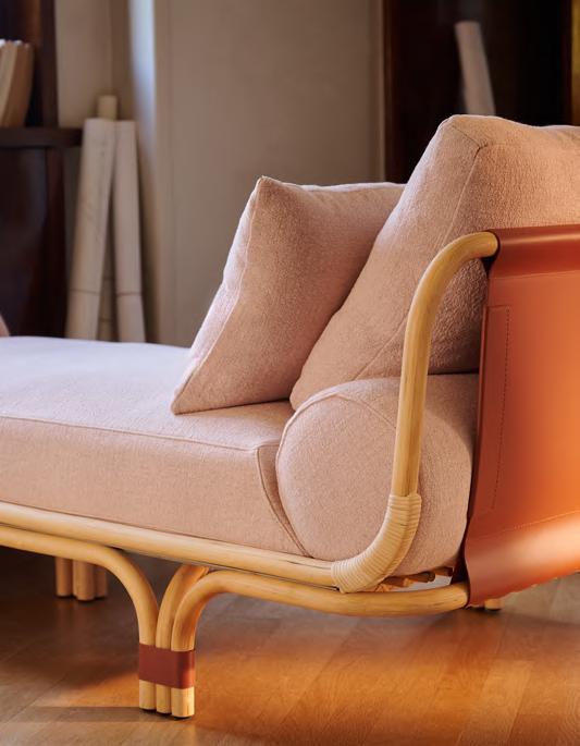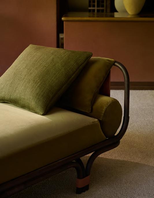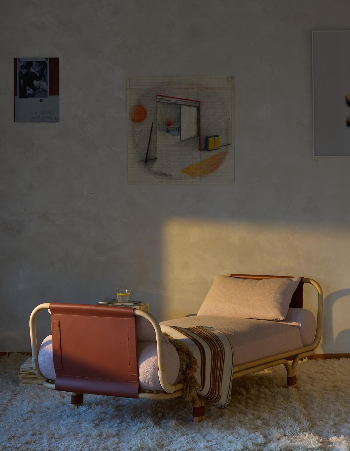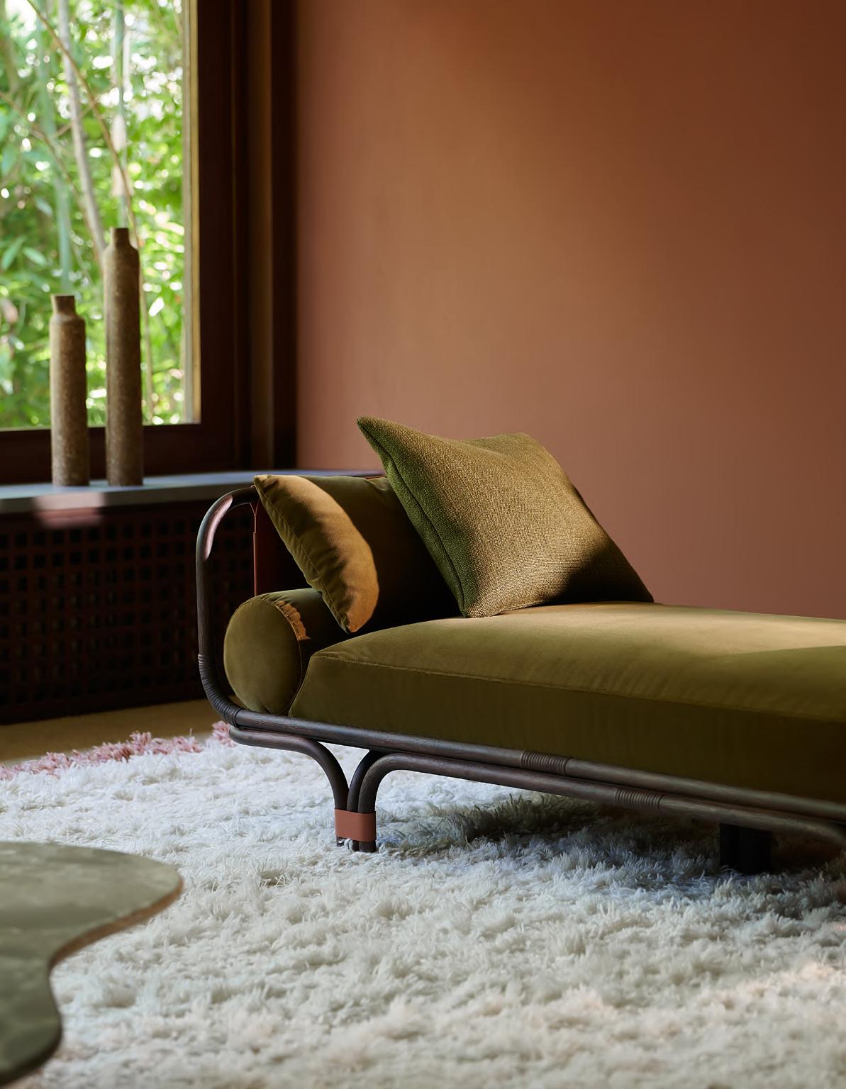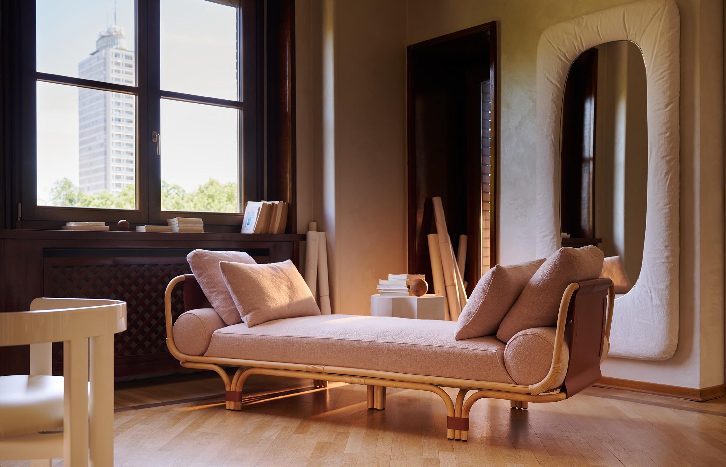 ISOLA BELLA daybed by Studiopepe, 2025, finish T214 matt natural stained rattan, upholstery Tuna 06. KUSCHEL rug by Salem van der Swaagh, 2023, color White.