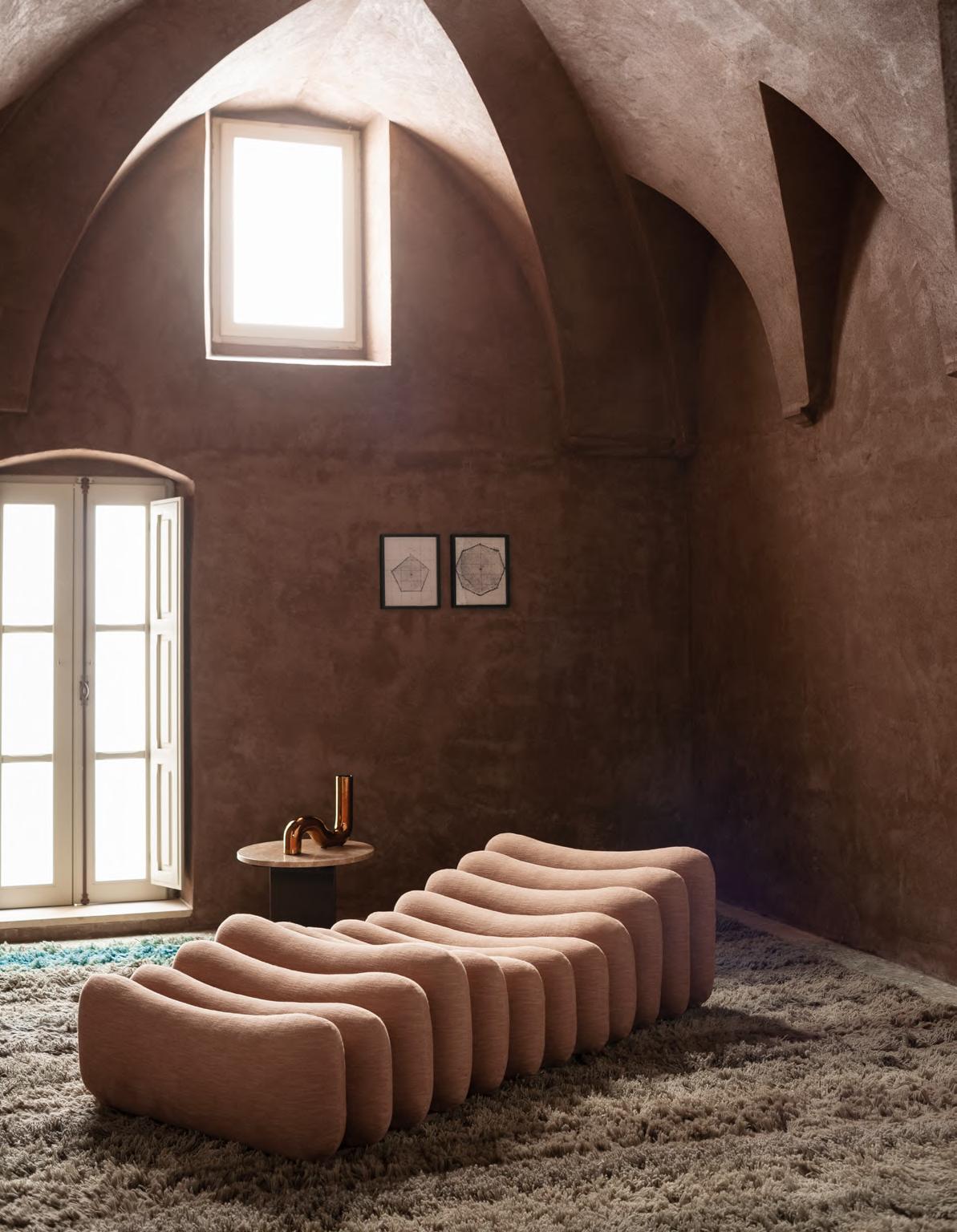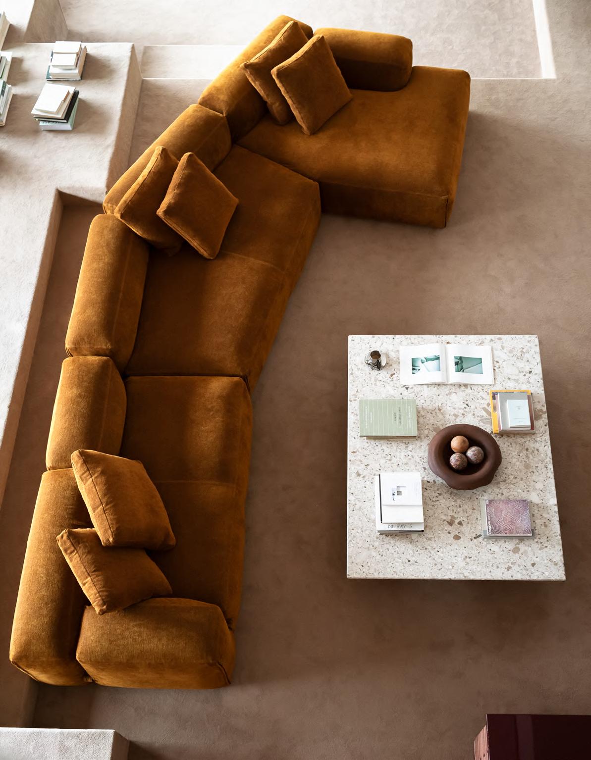 LE MURA XL sofa by Mario Bellini, 2025, clasp /zipper T148 Matt Black Nickel, upholstery Loto col. 02. GIAN low table by Studiopepe, 2025, T201 Powder Pink concrete base, T212 Ceppo Appia Antica marble top. ALTAR low table by EWE Studio, 2023, finish T178 Plaster Cement.