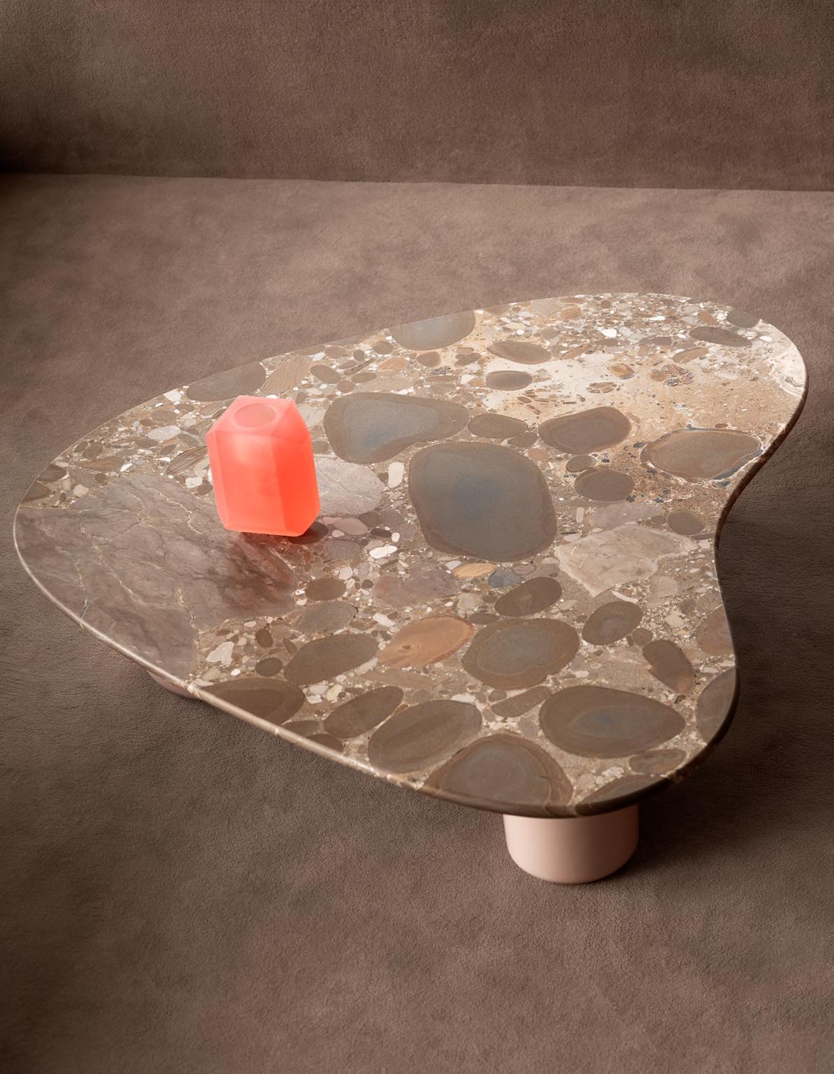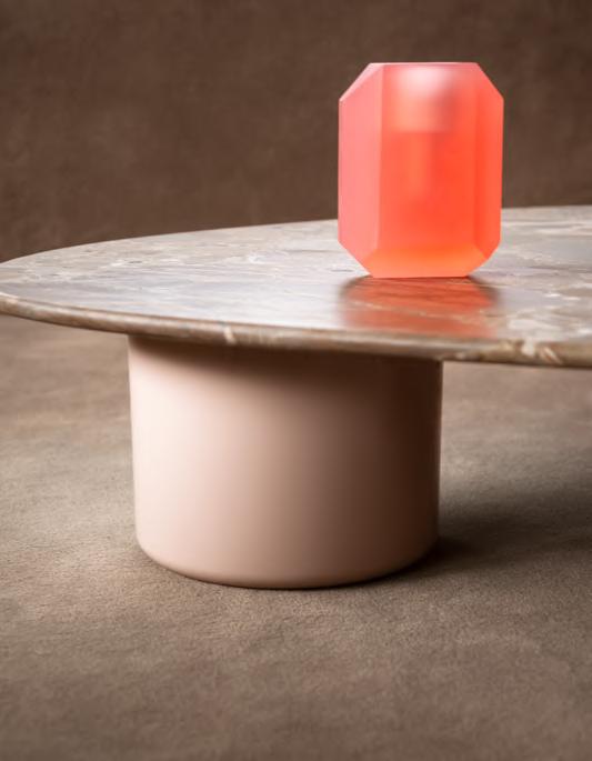 GIAN low table by Studiopepe, 2025, T201 Powder Pink concrete base, T212 Ceppo Appia Antica marble top. REFRACT vase by Objects of Common Interest, 2025.