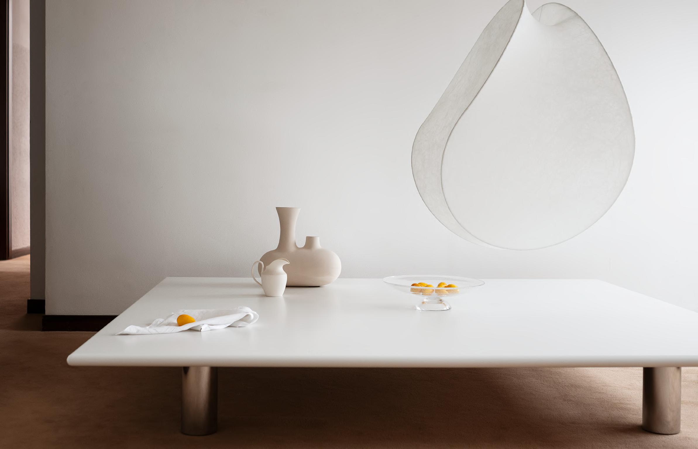 TAKO low table by Cini Boeri, (1970s) 2025, T23 Polished Chrome base, T209 Matte White Lacquered Wood top. EQUINOX lamp by Studiopepe, 2023.