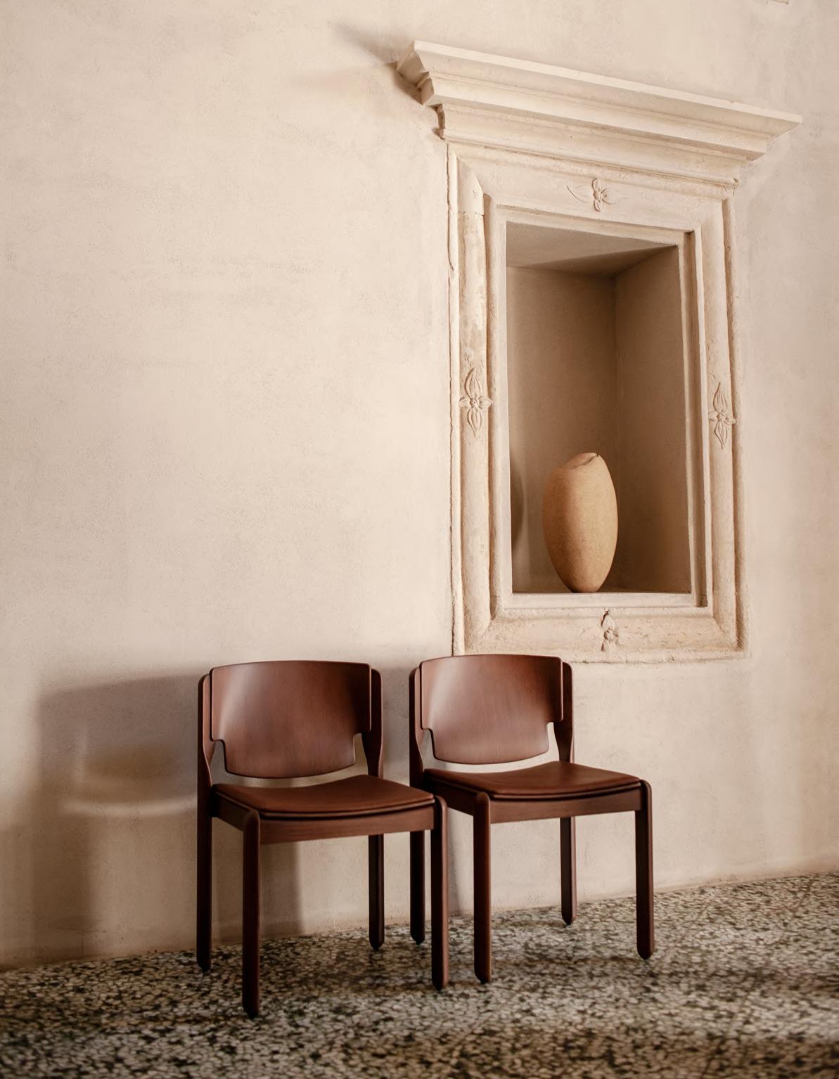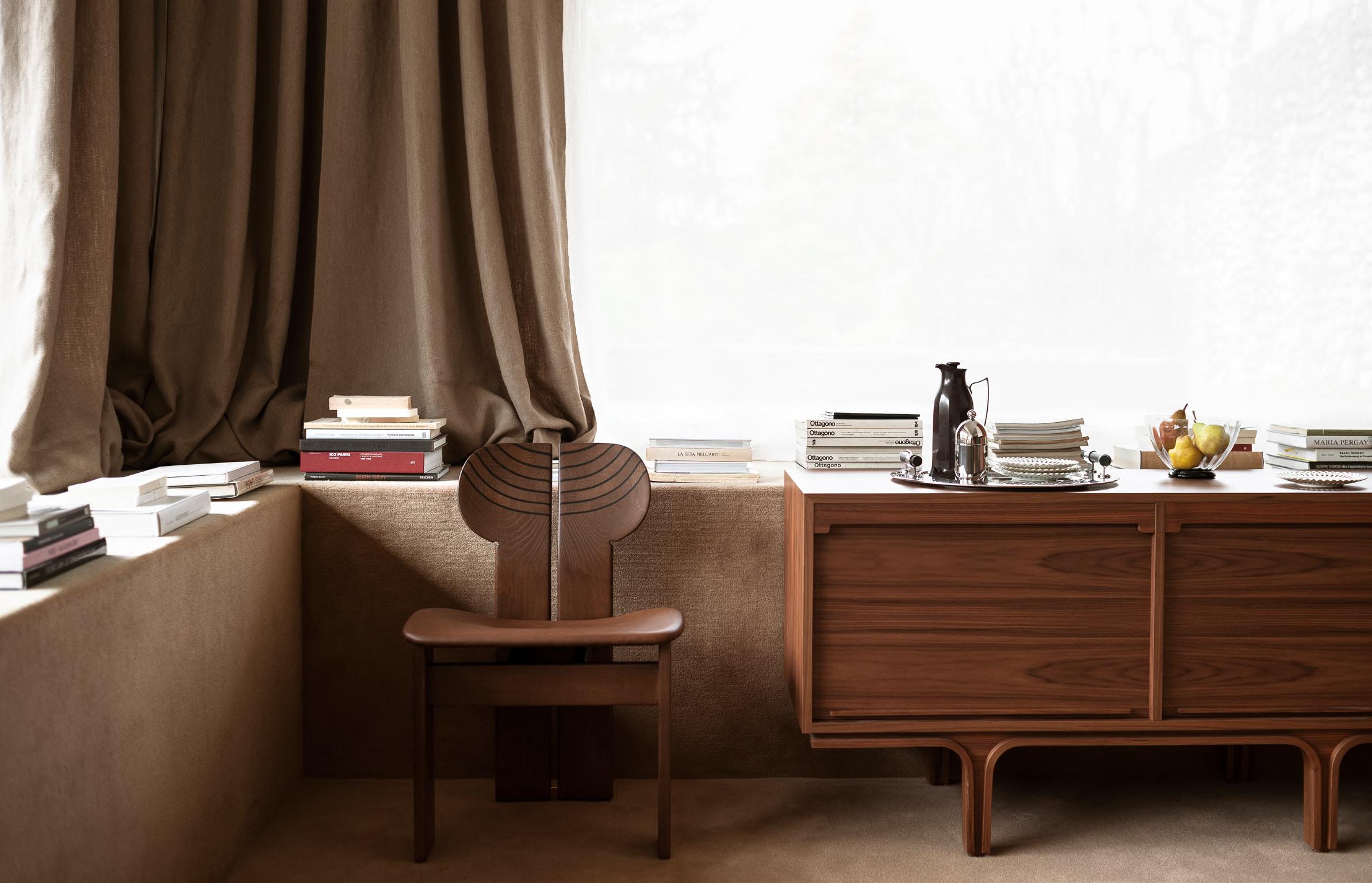 AFRICA chair by Afra and Tobia Scarpa, (1975) 2025, finish T135 Canaletto Walnut, upholstery Anilina col. 02. SERIE 500 Model 500/3 storage cabinet by Gianfranco Frattini, (1960) 2024, finish T135 Canaletto Walnut.