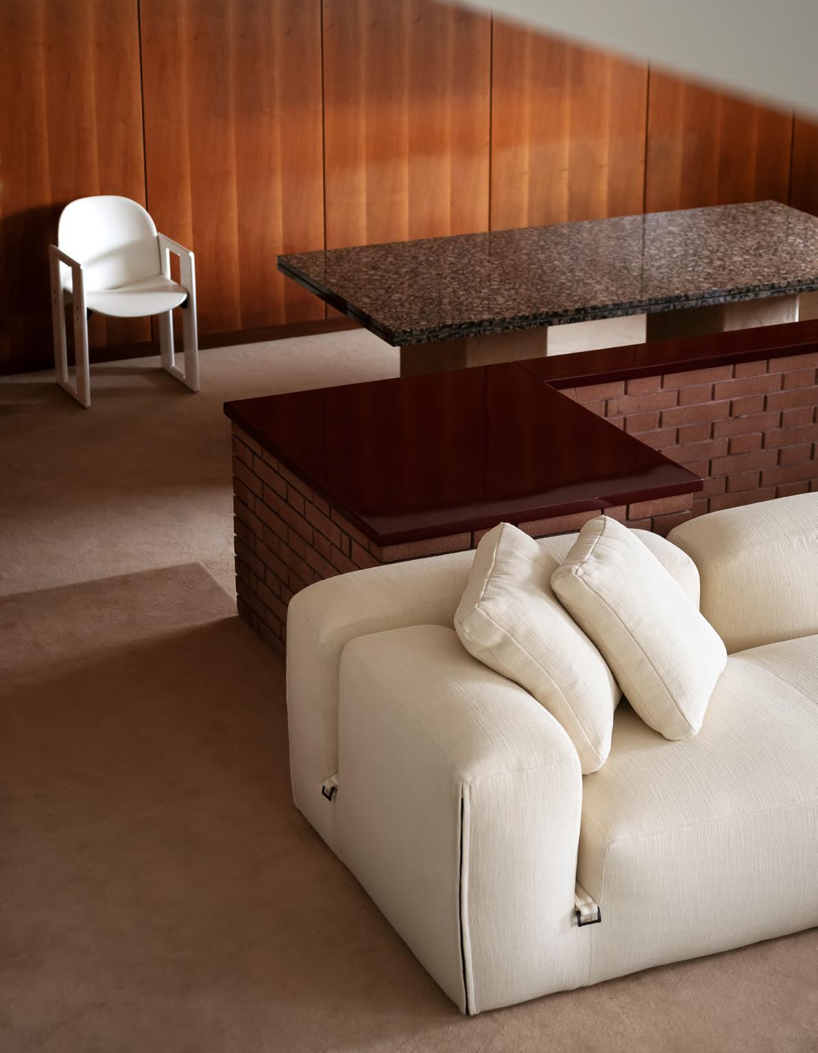 LE MURA XL sofa by Mario Bellini, 2025, clasp /zipper T148 Matt Black Nickel, upholstery Loto col. 02. DIALOGO chair with armrests by Tobia Scarpa, (1973) 2023, finish T198 Glossy Lacquered Wood White, upholstery Dialogo Zafira 04.