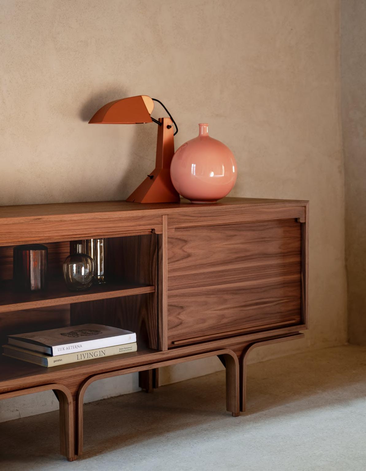 SERIE 500 Model 500/3 storage cabinet by Gianfranco Frattini, (1960) 2024, finish T135 Canaletto Walnut. E63 lamp by Umberto Riva, (1963) 2017, finish T64 Brush Matt Copper. BUBBLE vase by Alvino Bagni, 2018, finish T101 Glazed Ceramic Pink.