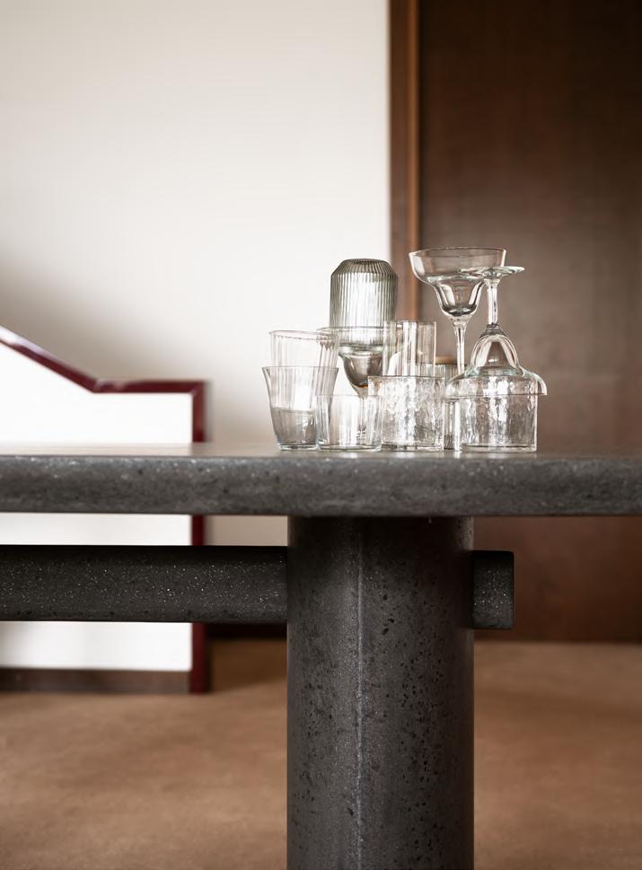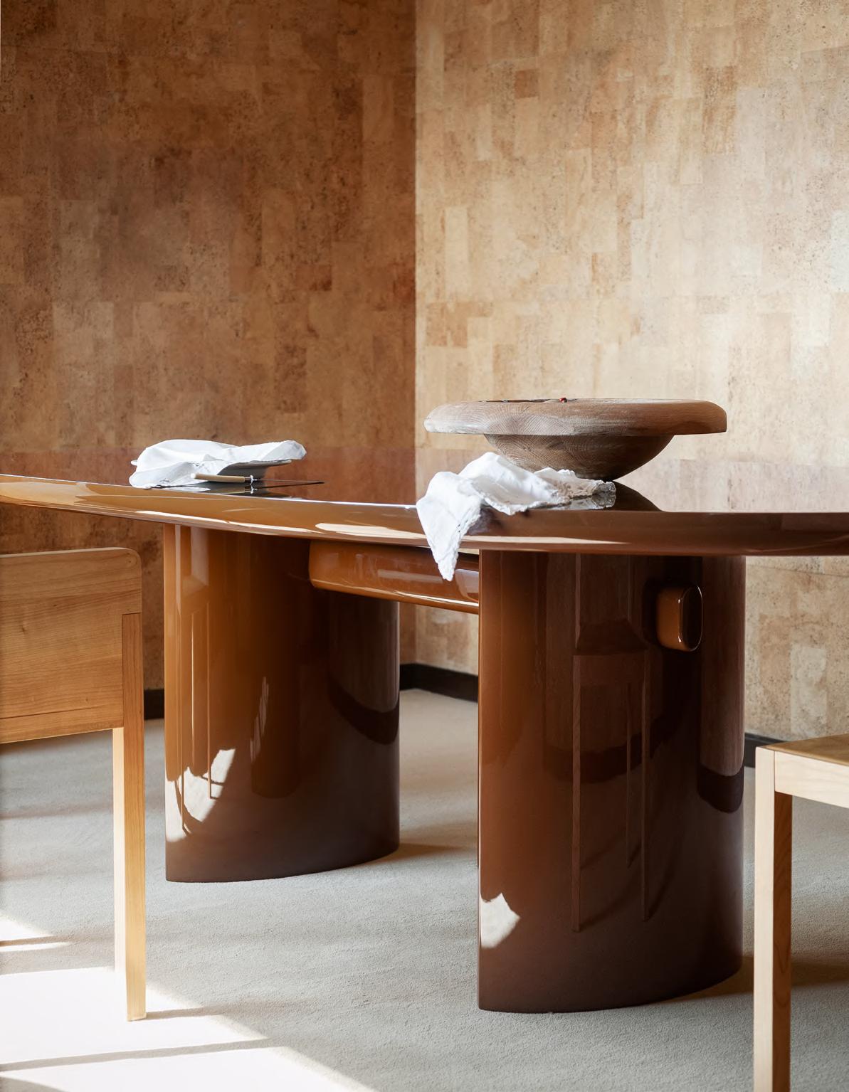 TORII LOVE dining table by Studiopepe, 2025, finish T202 Lacquered Wood Chocolate. KLOTSKI chair by Michael Anastassiades, 2025, finish T205 Natural Stained Cherry, upholstery Zahir col. 14.