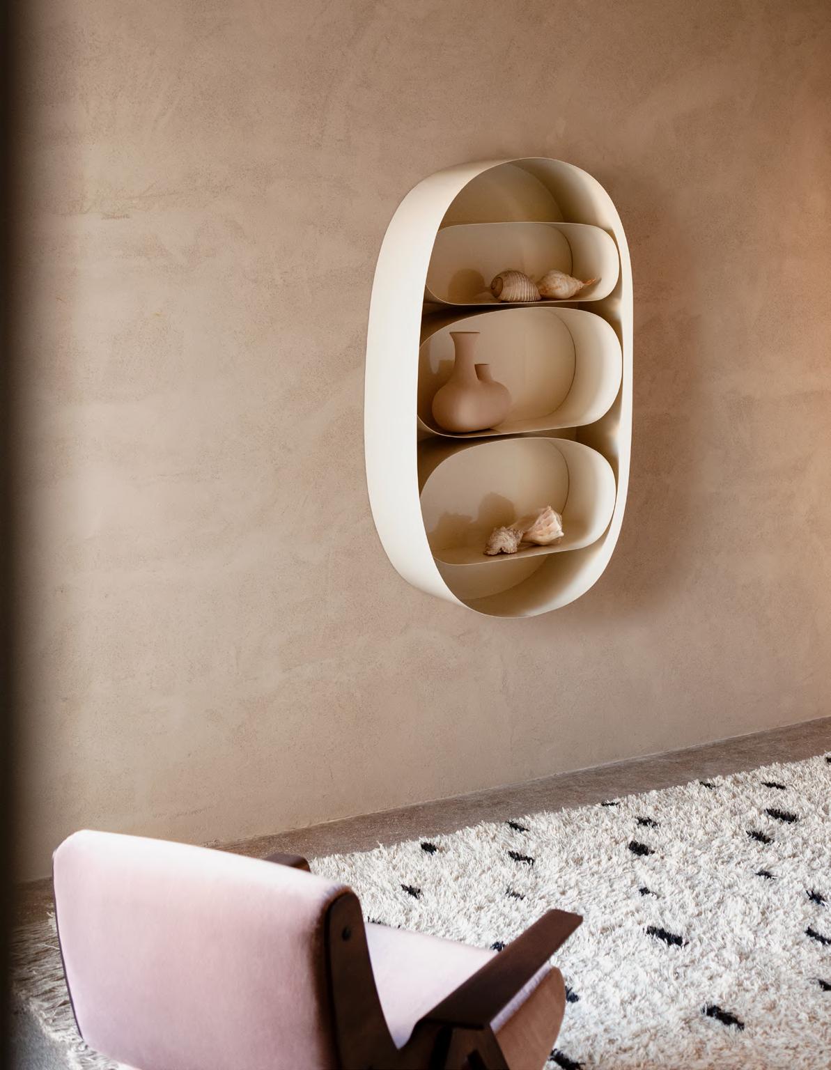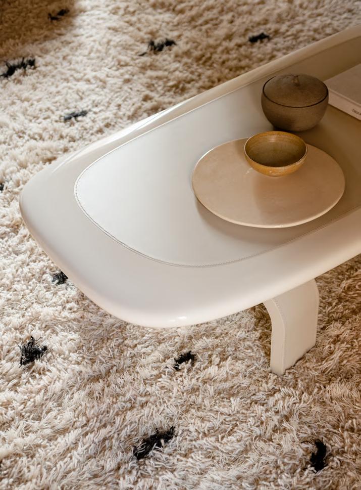 CASSERO low table by Roberto Sironi, 2024, finish T195 Powder Pink (W 110 cm), finish T194 Earth Tones (W85 cm). VERTICAL NEST floor lamp by Brian Thoreen, 2023. E63 lamp by Umberto Riva, (1963) 2017, finish T25 Matt Champagne Gold. SOPHIA lamp by Studiopepe, 2022, finish White. AQUA REGIS vase by Studiopepe, 2020, color White. KUSCHEL rug by Salem van der Swaagh, 2023, color White and Caramel.