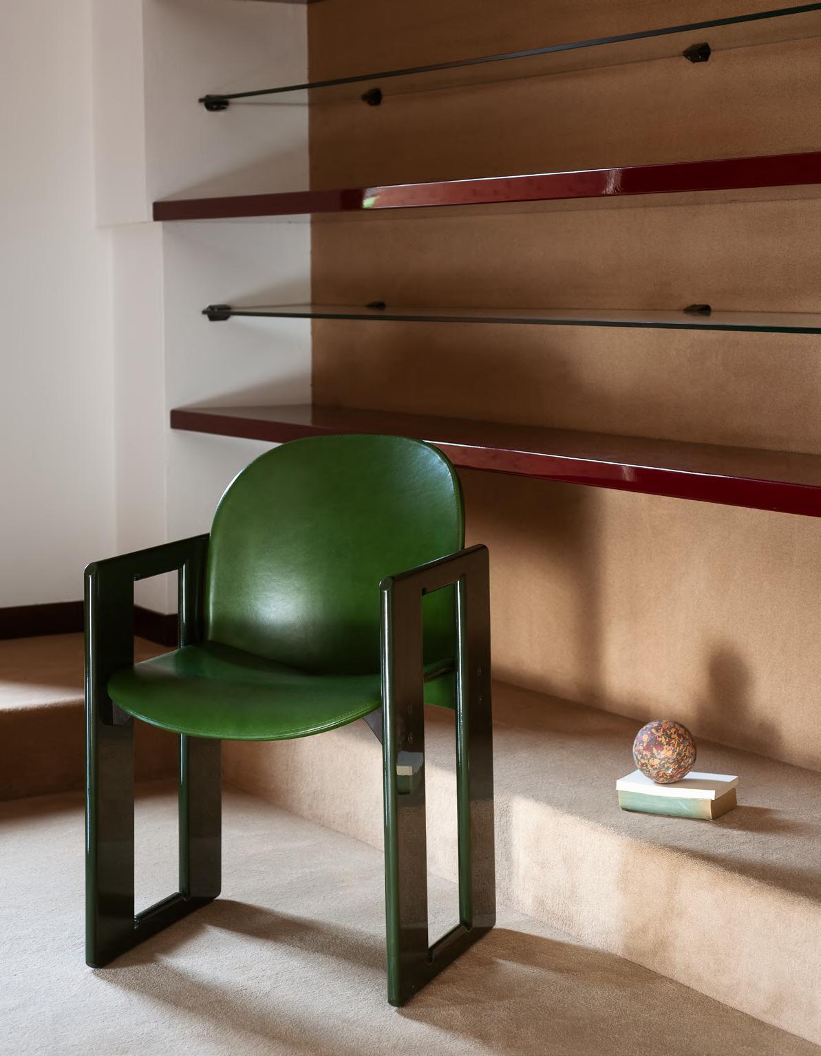 CLOCKWISE table by Michael Anastassiades, 2024,finish T190 Matt Mediterraneo Green marble. DIALOGO chair with armrests by Tobia Scarpa, (1973) 2023, structure T169 Canaletto Walnut. MANTIQUEIRA vase by Domingos Tótora, 2019, color Brown. LUCIE vase by Studiopepe, 2022.