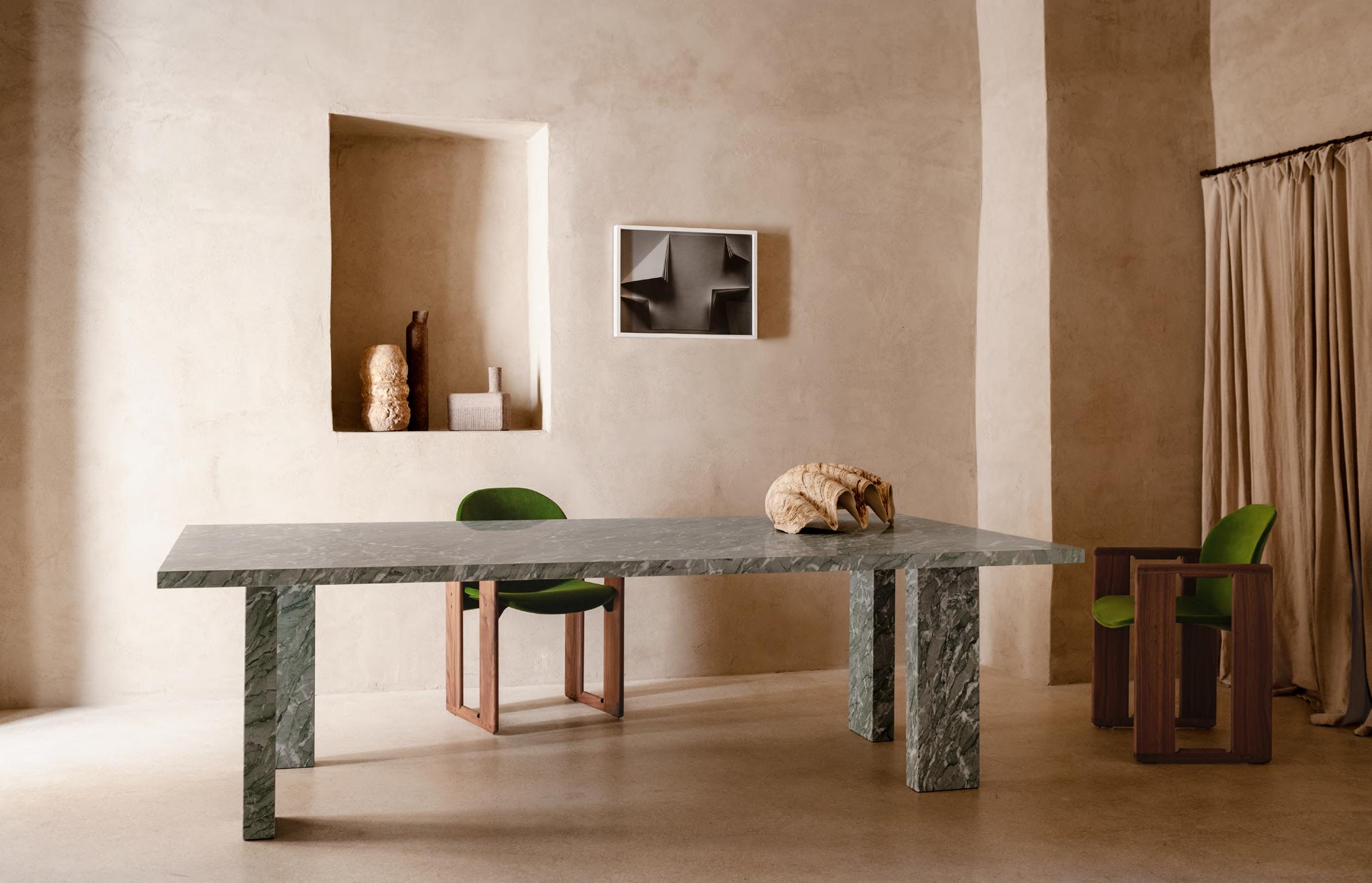 CLOCKWISE table by Michael Anastassiades, 2024, finish T190 Matt Mediterraneo Green marble. DIALOGO chair with armrests by Tobia Scarpa, (1973) 2023, structure T169 Canaletto Walnut.