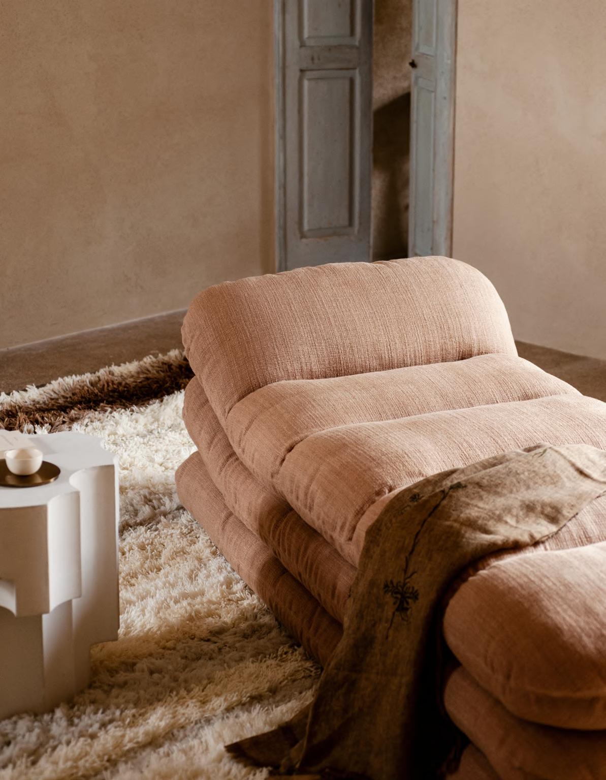 SOLAR daybed by Faye Toogood, 2024. ALTAR low table by EWE Studio, 2023, finish T178 Plaster Cement. KUSCHEL rug by Salem van der Swaagh, 2023, color White.