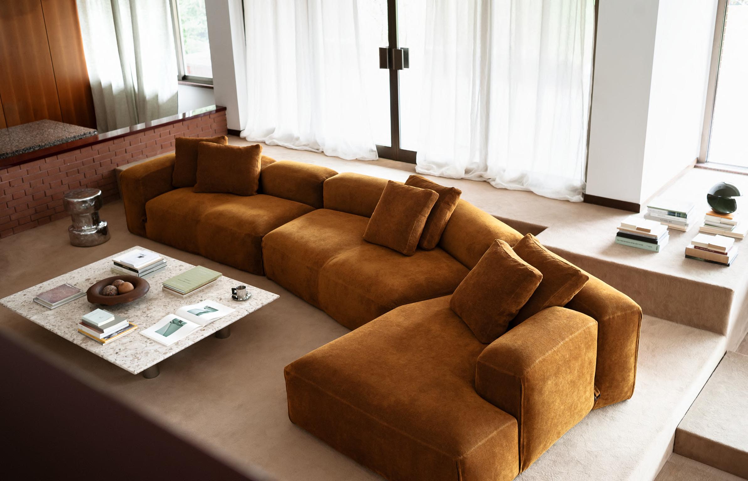 LE MURA XL sofa by Mario Bellini, 2025, clasp /zipper T147 Antique Copper, upholstery Take col. 06. TAKO low table by Cini Boeri, (1970s) 2025, T23 Polished Chrome base, T213 Ceppo Cremo marble top.