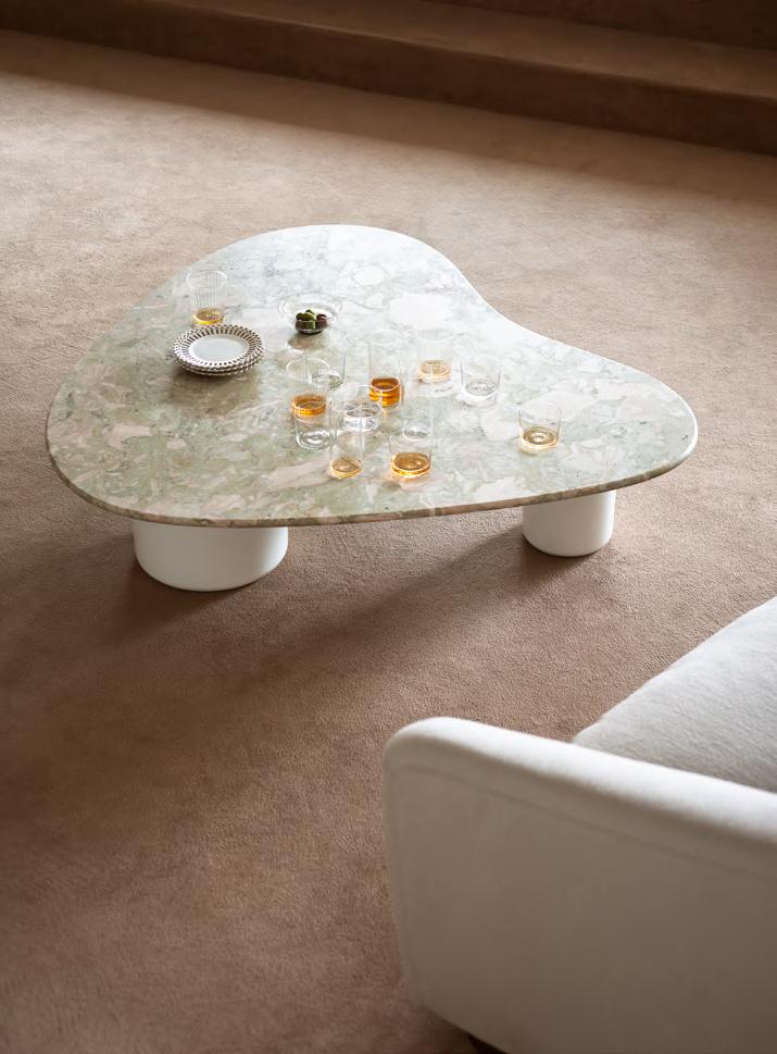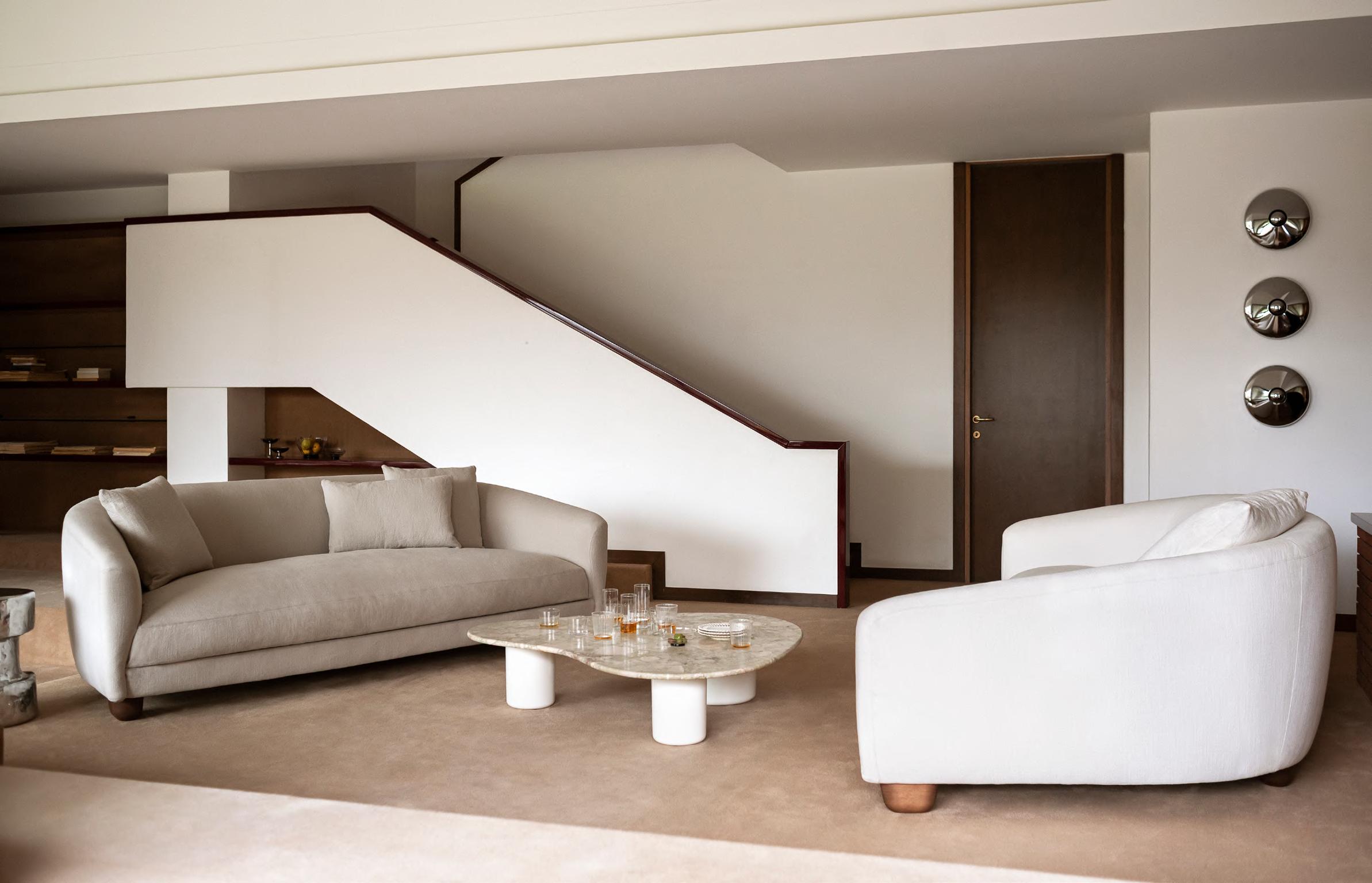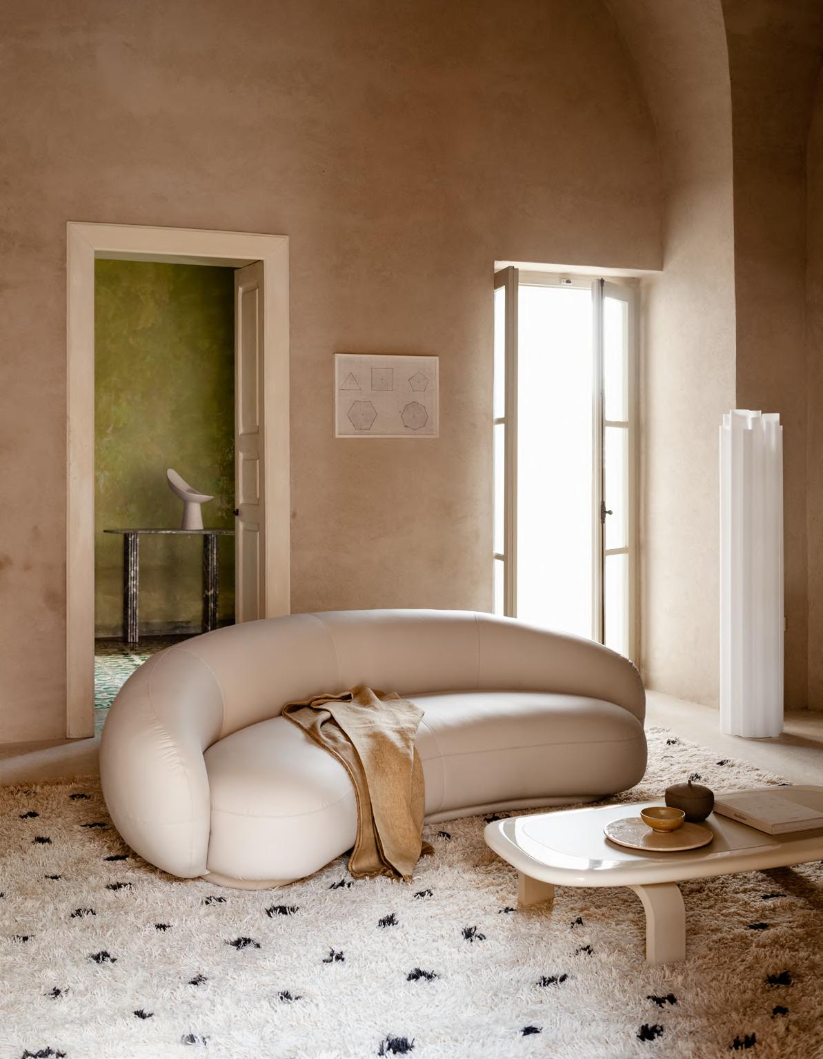 ORBIT low table by Faye Toogood, 2024, Chalk mood. JULEP® sofa by Jonas Wagell, upholstery Zeus col. 01. SOPHIA lamp by Studiopepe, 2022, finish White. VERTICAL NEST floor lamp by Brian Thoreen, 2023. COLOMBO console by Lorenzo Bini, 2023, finish T161 Matt Fior di Pesco marble. JACOB rug by Salem van der Swaagh, 2024, color White.