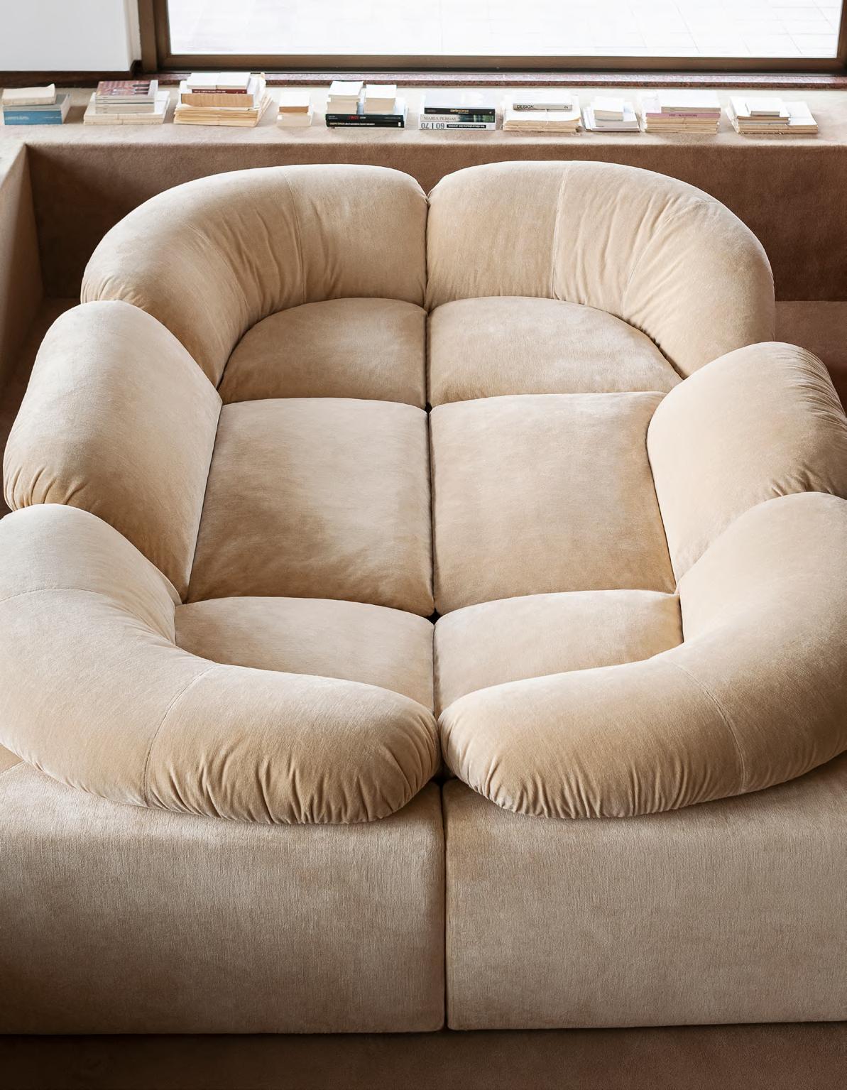ADDITIONAL SYSTEM daybed by Joe Colombo, (1967) 2024, upholstery Tuna col. 03. TRONO low table by Umberto Bellardi Ricci, 2023, T160
