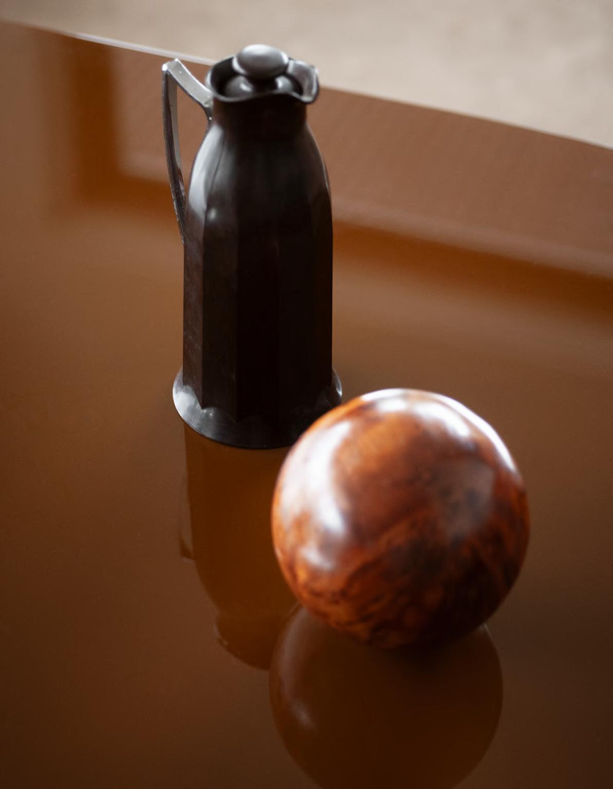 CLOCKWISE table by Michael Anastassiades, 2024, finish T191 Matt Avocado Green marble. PAOLA chair by Vico Magistretti, (1967) 2024, finish T185 Walnut Stained, upholstery Aniline Leather col.02. MANTIQUEIRA vase by Domingos Tótora, 2019, color Brown. BUBBLE vase by Alvino Bagni, 2018, finish T100 Green.