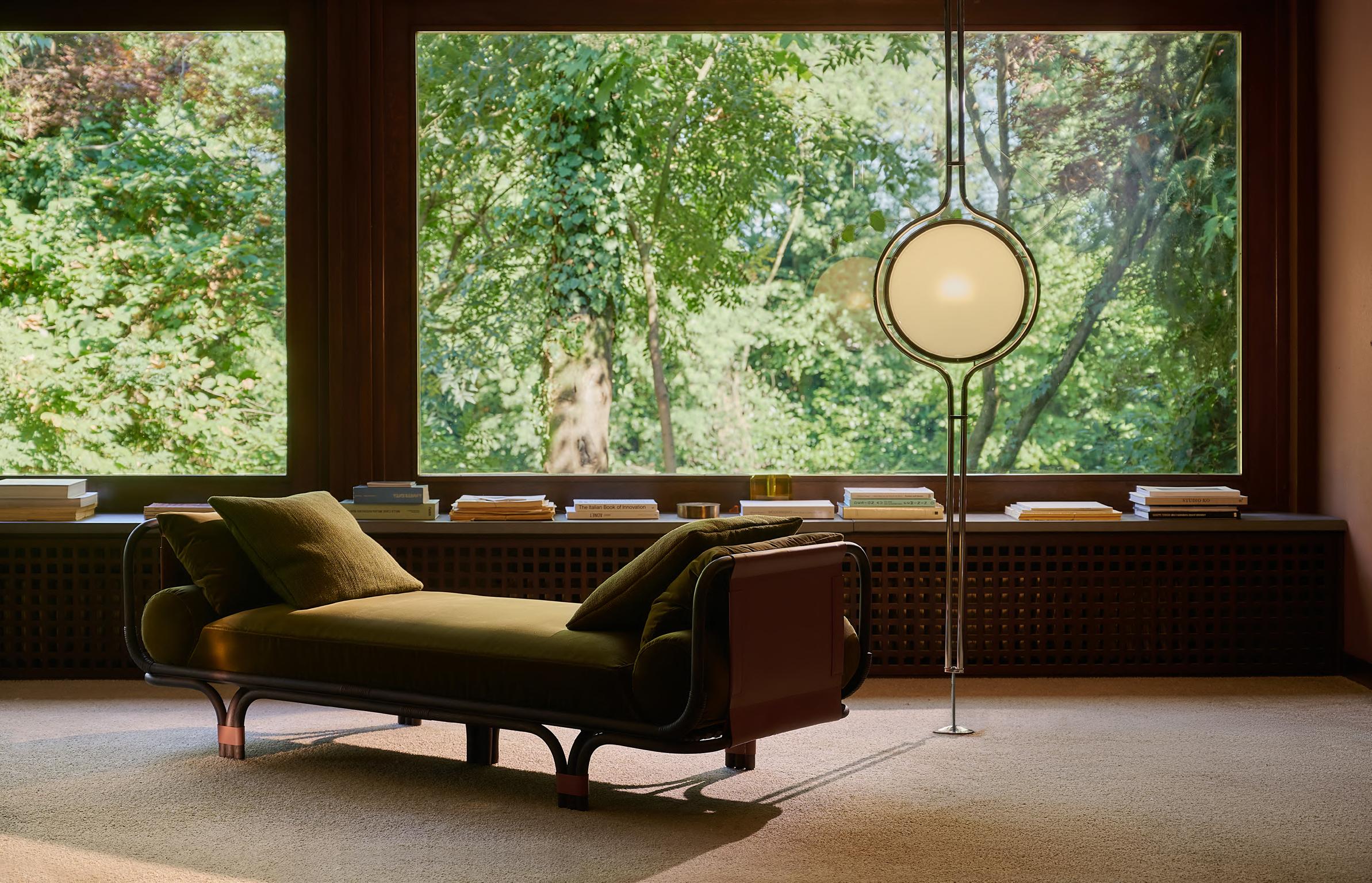 ADDITIONAL SYSTEM daybed by Joe Colombo, (1967) 2024, upholstery Tuna col.03. ORSOLA armchair by Gastone Rinaldi, (1970) 2021, T23 Polished Chrome structure, upholstery Aniline Leather col. 02.