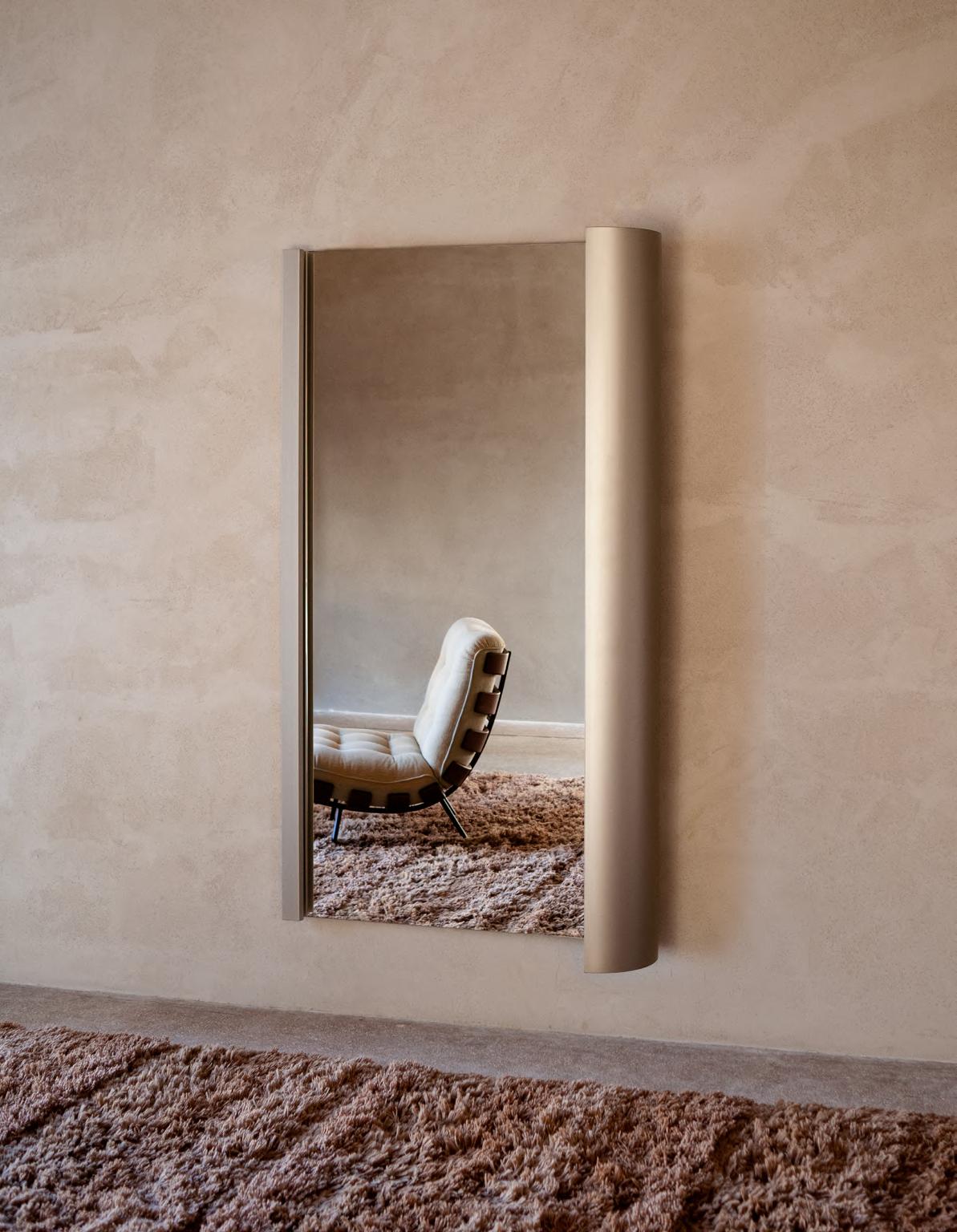 ANCORA mirror by Umberto Bellardi Ricci, 2024, finish T193 Satin Steel. COSTELA, armchair by Martin Eisler, (1952) 2019, structure T185 Walnut. KUSCHEL rug by Salem van der Swaagh, 2023, color Caramel.