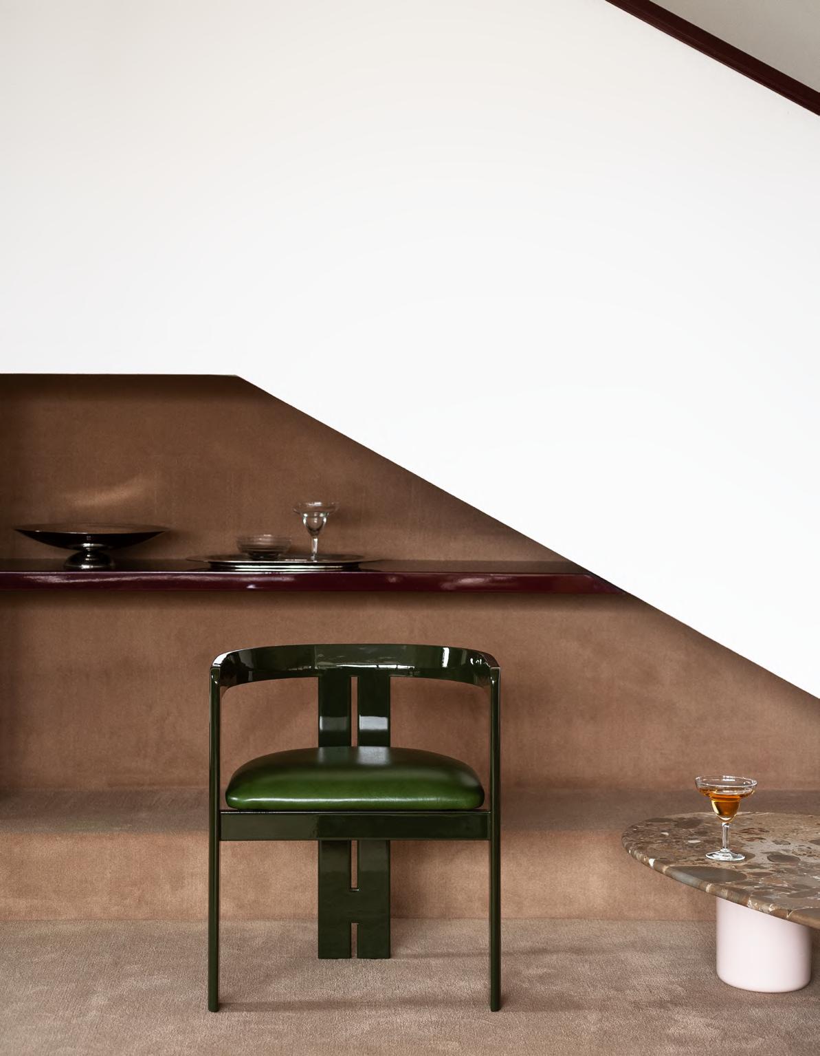 PIGRECO chair by Tobia Scarpa, (1959) 2021, finish T199 Glossy Lacquered Wood Dark Green, upholstery Zareen col. 03. GIAN low table by Studiopepe, 2025, T201 Powder Pink concrete base, T212 Ceppo Appia Antica marble top.