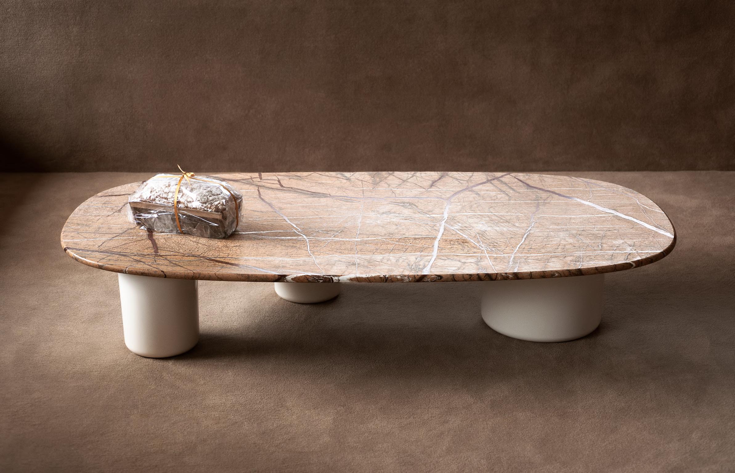 PAN low table by Studiopepe, 2025, T198 Glossy Lacquered White concrete base, T210 Forest Brown marble top.