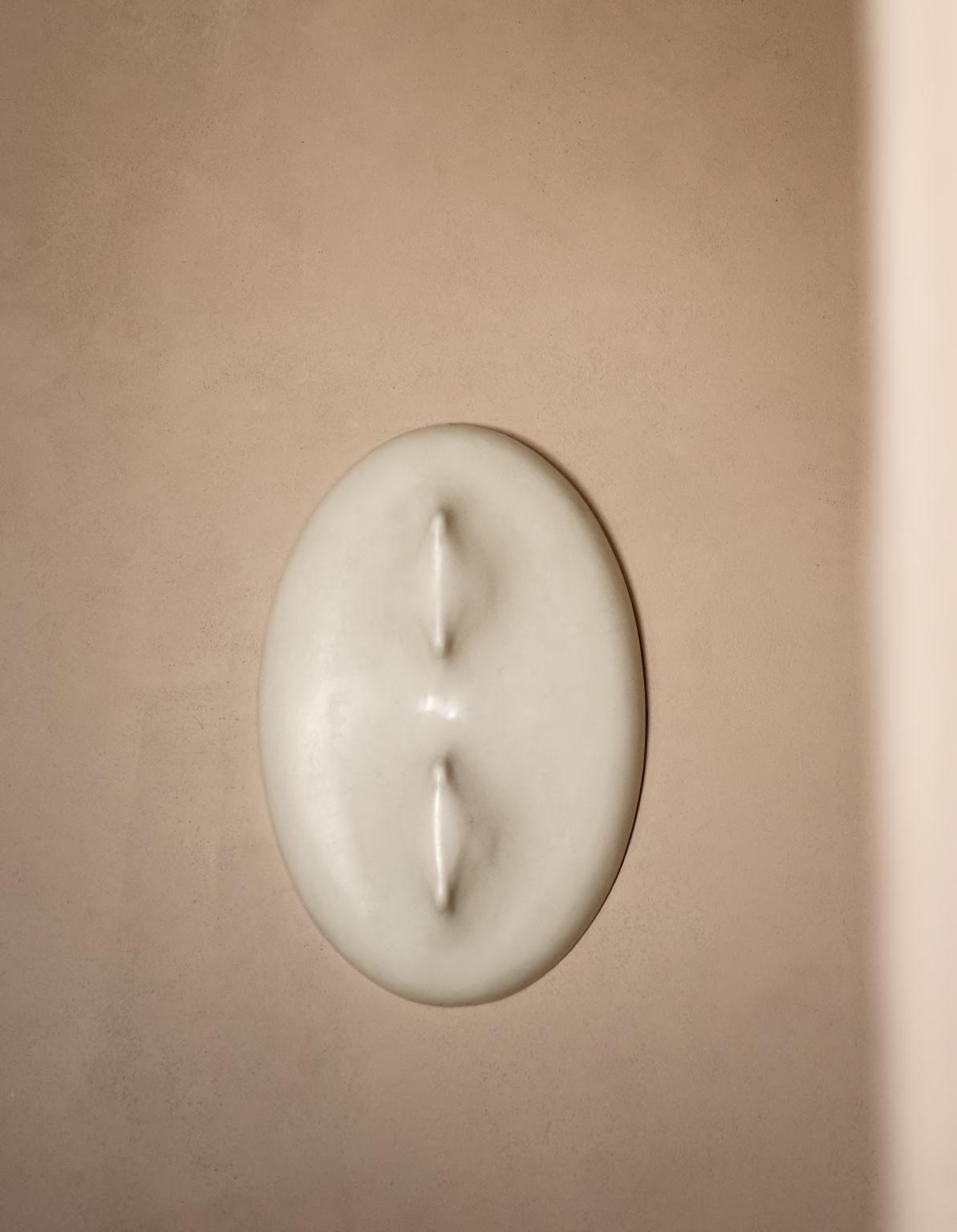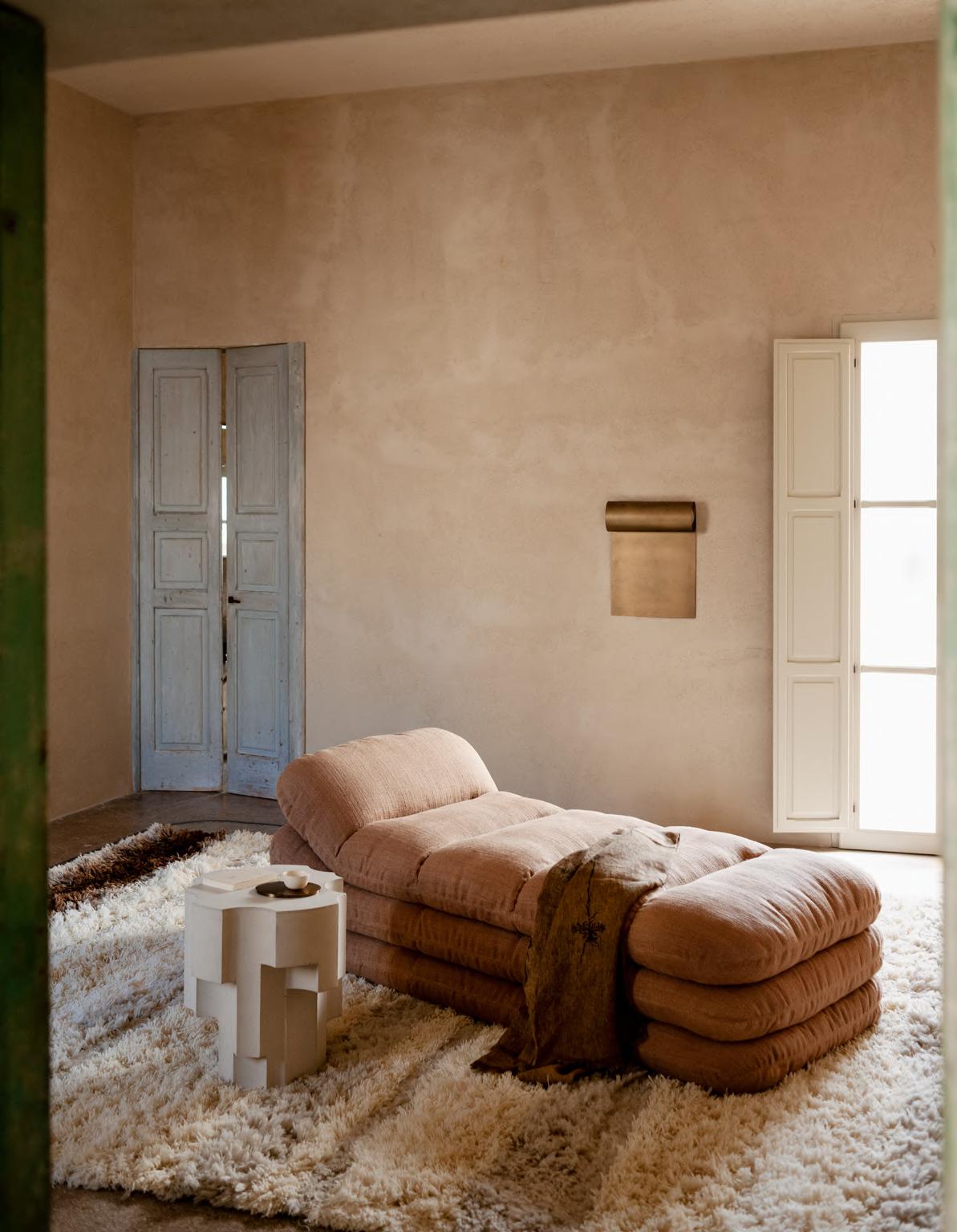 SOLAR daybed by Faye Toogood, 2024. ALTAR low table by EWE Studio, 2023, finish T178 Plaster Cement. DORIC wall lamp by Umberto Bellardi Ricci, 2024, finish T192 Brass Dèlabrè. KUSCHEL rug by Salem van der Swaagh, 2023, color White.