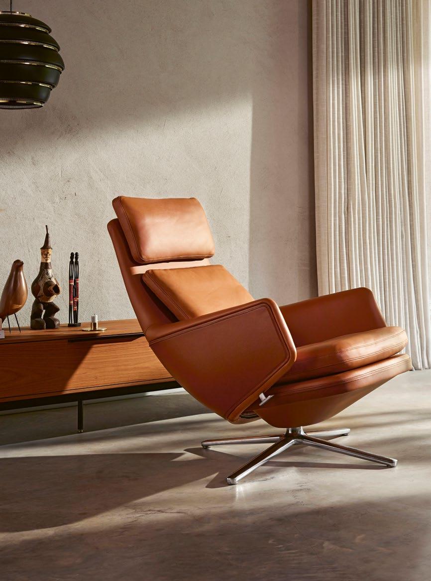 The swivel-based lounge chairs Repos and Grand Repos convey a feeling of exceptional comfort with their generous padding, inviting armrests and high backs. Thanks to the synchronised mechanism concealed beneath the upholstery, sitters can move from an upright posture to a reclined angle for resting and lock the backrest in any position. The resistance of the backrest can be manually adjusted to the user’s weight. Repos and Grand Repos are available in two different seat heights, as well as in a choice of fabric or leather covers in a wide range of colours.
