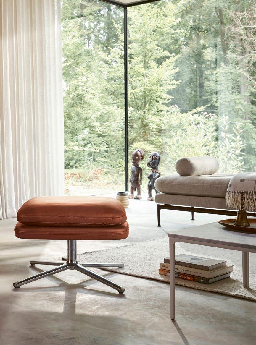( 1 ) Grand Relax & Ottoman · Leather Premium F, 97 cognac / Leather Forte (deco), 01 cognac (dark) · Antonio Citterio, 2019 ( 2 ) Suita Daybed · Dumet, 03 beige/grey · Antonio Citterio, 2010 ( 3 ) Plate Table 410 × 410 mm · Marble · Jasper Morrison, 2004 ( 4 ) Eames House Bird · walnut