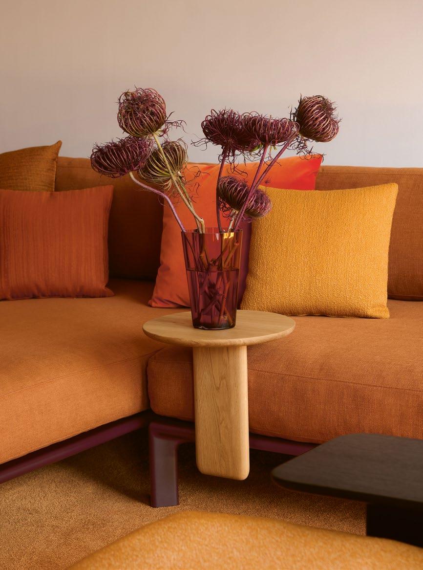 ( 1 ) Anagram Sofa · Hola, 02 terracotta · 60 dark bordeaux powder-coated (textured) · Panter&Tourron, 2024 ( 2 ) Anagram attachable table Ø 350 · 70 natural solid oak, oiled finish