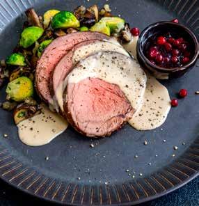 6. Skjær steken i 3-5 mm tykke skiver og server med sopp, rosenkål og viltsaus.