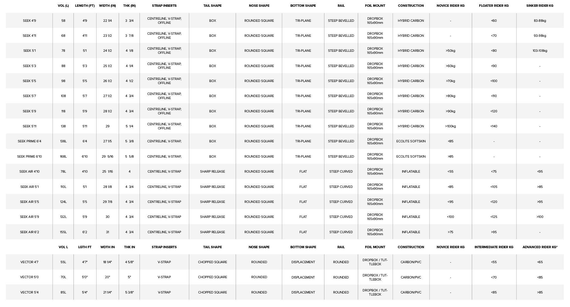 • When selecting board size choose a “floater” more than your rider kg in litres