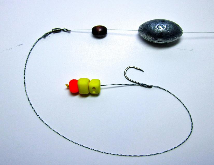 Components: PB KD Curve #8 hook (ideal for sweetcorn sized baits but use a #6 or #4 for larger baits like Feed Corn) tied to 6 – 8″ of soft braided hook link plus a Short Shank Hook Aligner. A Ringed #24 Bait Swivel is positioned between two hook beads and a ‘Shot-On-Hook’ tungsten rubber bead placed as shown in the picture. You can also use a split shot clamped around a short piece of braid over the hook bend.